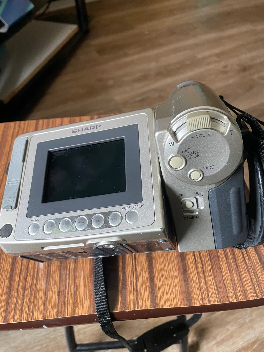 This is a Sharp camcorder. It has a built-in screen and multiple control buttons. The device features buttons for menu, mode display, volume control, recording, and fade. It also has a switch for camera and VCR modes.