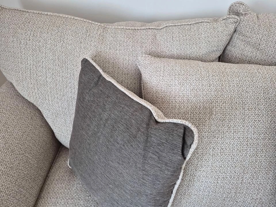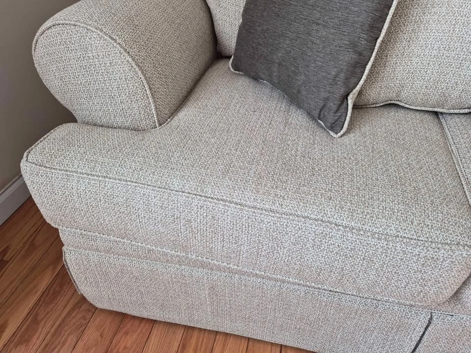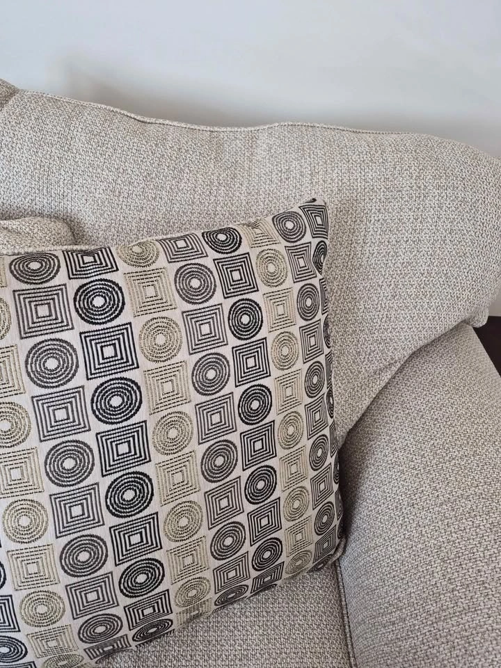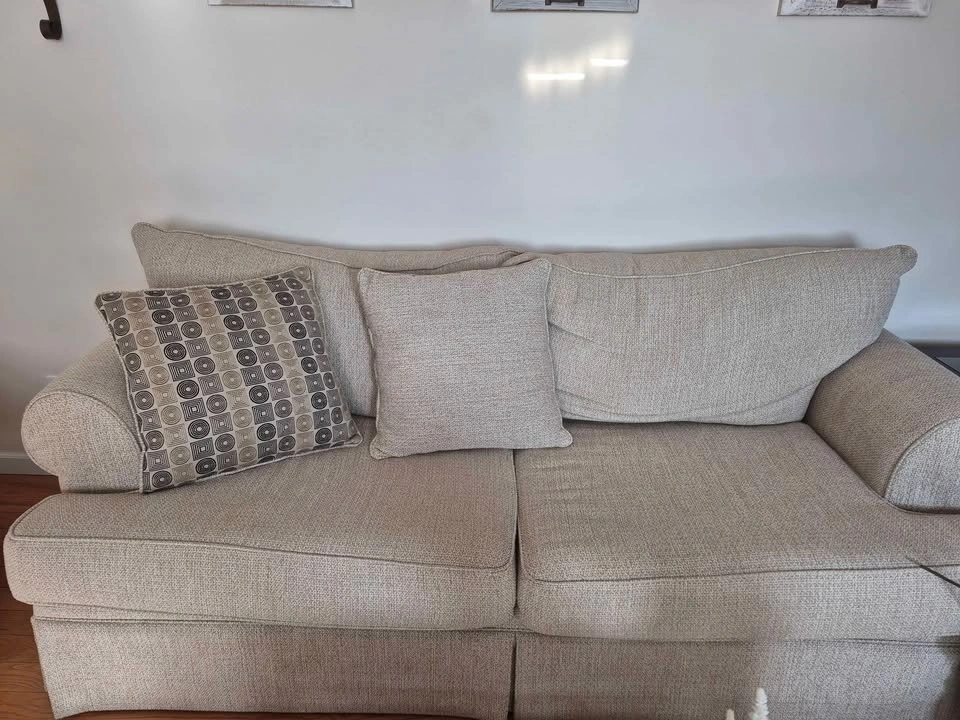 Excellent condition sofa and love seat. Buy one or both. Pillows included. I love them, but I'm moving and don't feel like the hassle of transporting them. Pictures look a little grayish, but they're more like a cream and beige color with a woven fabric. Must be able to move them yourself.