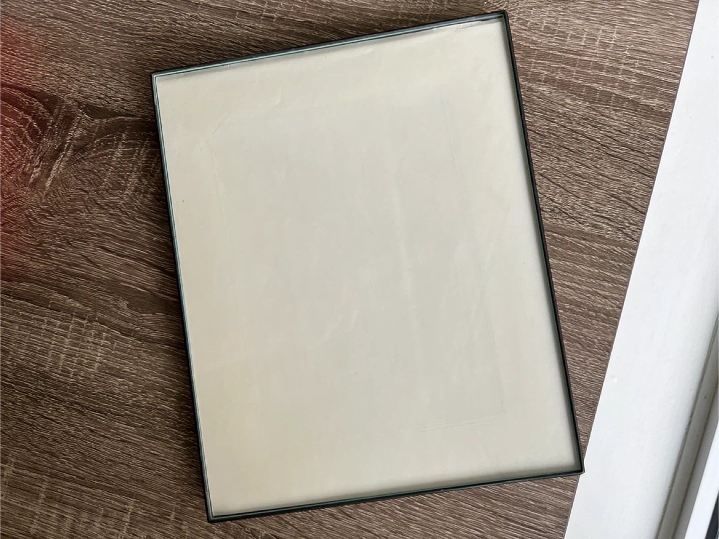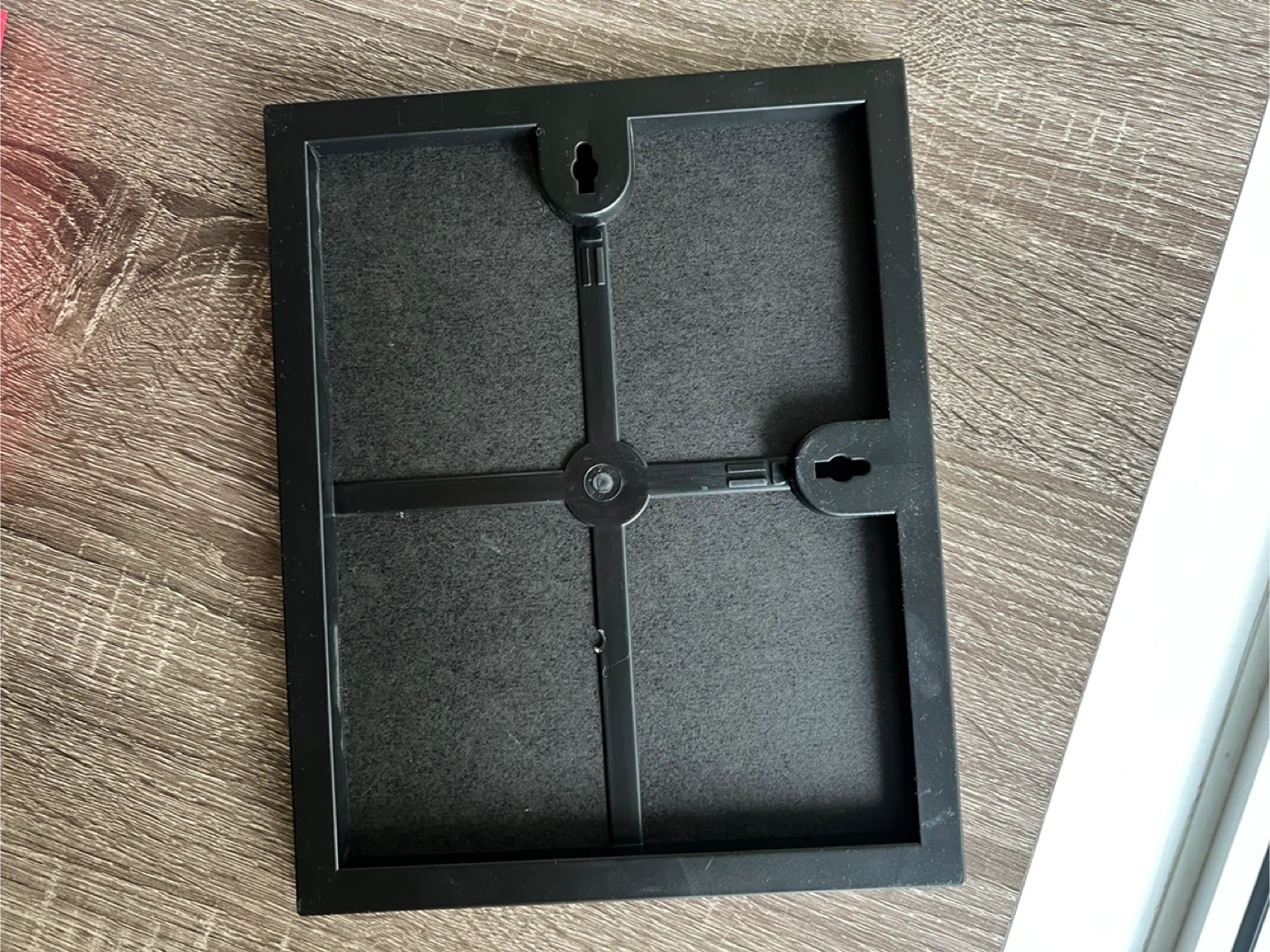 The black frame is plastic. You have to push the glass piece out from the back to insert the photo and then press it back it in place.