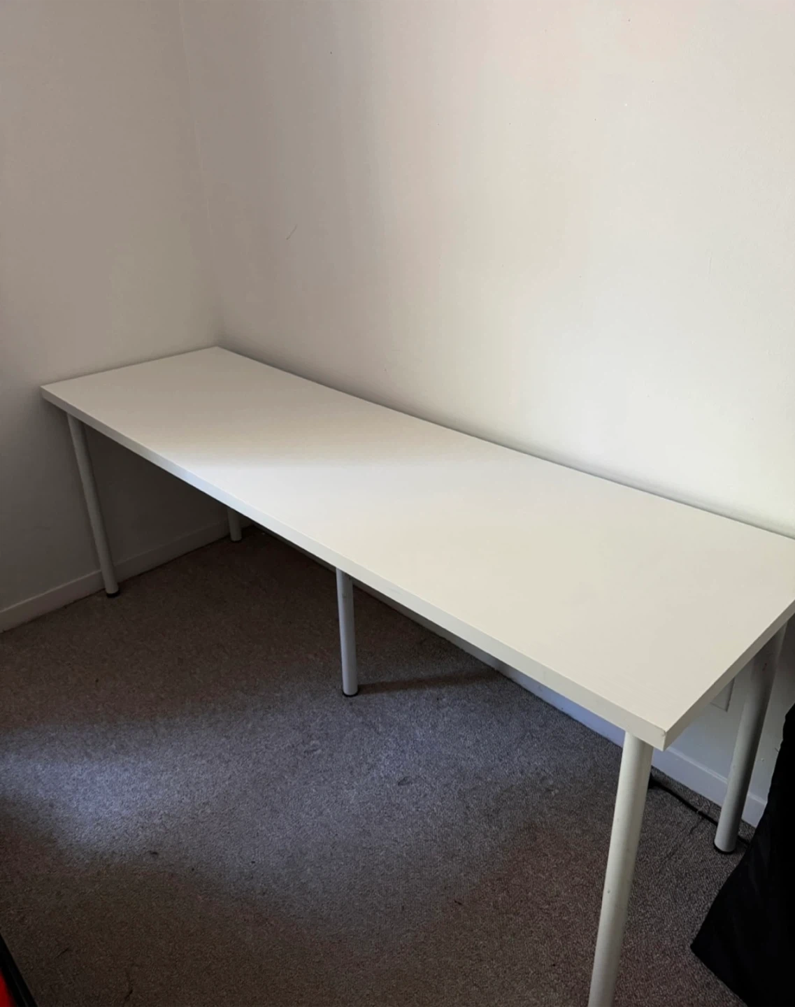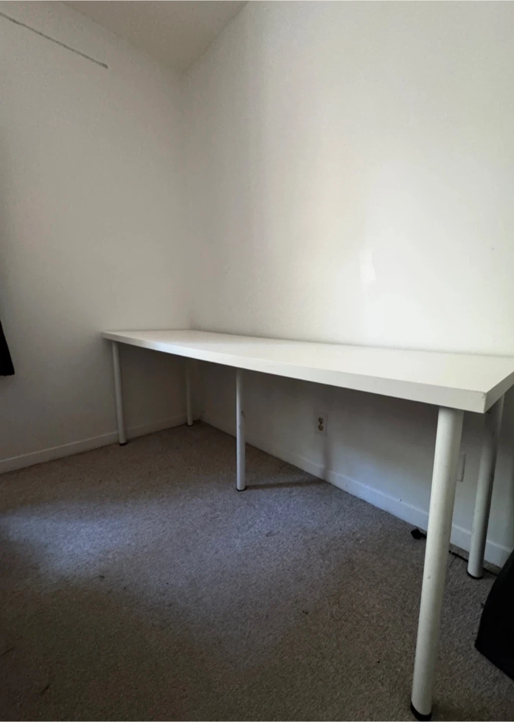 Moving out sale. Selling a long white desk designed to fit into a corner. It's supported by simple legs. No scratches. It's in great condition and i’ve disassembled all 5 legs for easy carry.