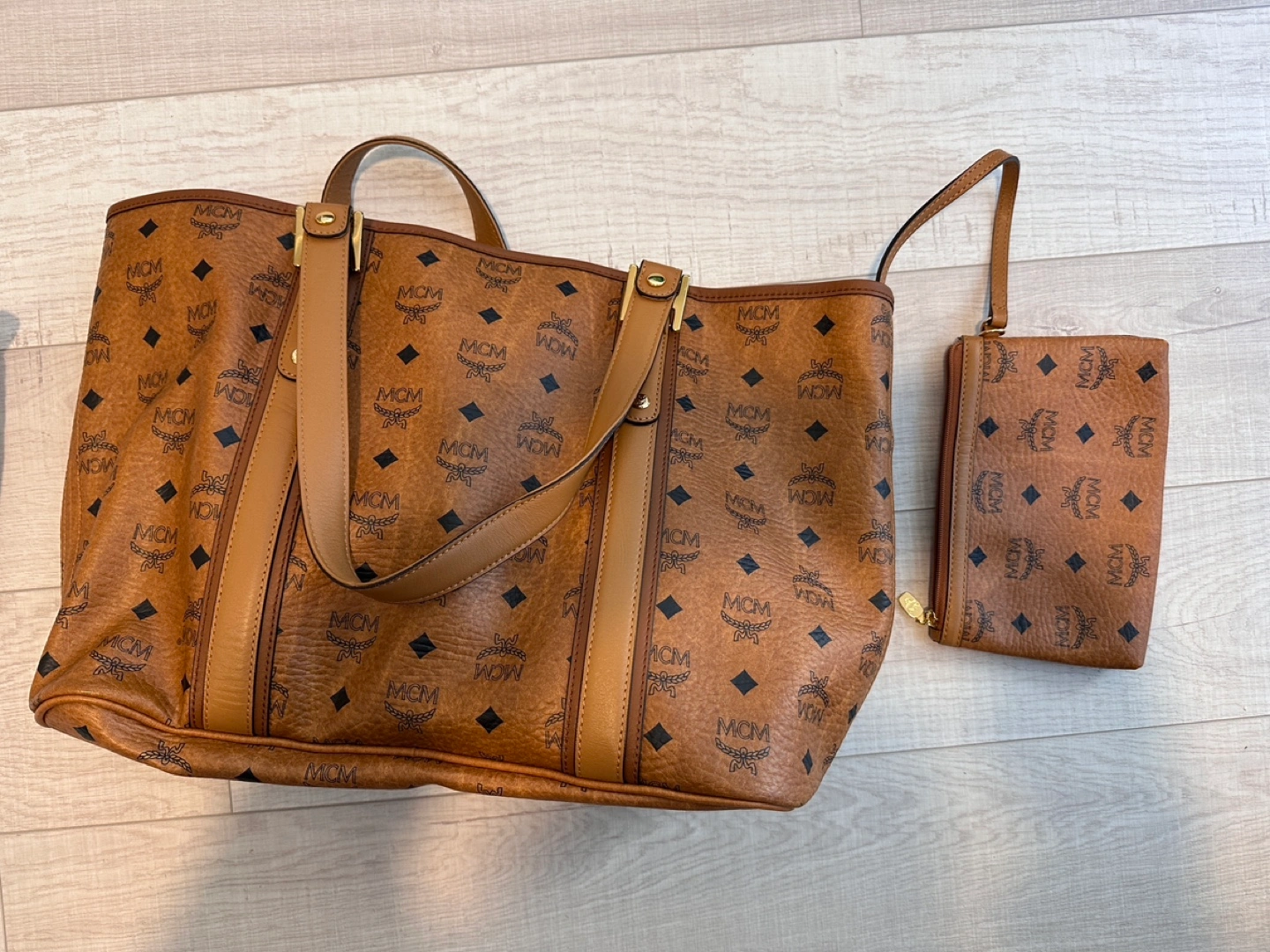 MCM brown tote bag. Features MCM's signature Visetos monogram. Includes a smaller matching pouch - like new, barely used