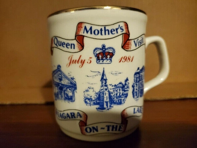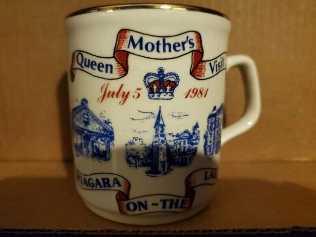 A nice souvenir mug commemorating the Queen Mum’s visit to Niagara on the Lake in 1981. In excellent condition for a 40-year old cup. Gold rim completely intact. Mug is made in England, decorated in Canada. $5.00, pick up only.
