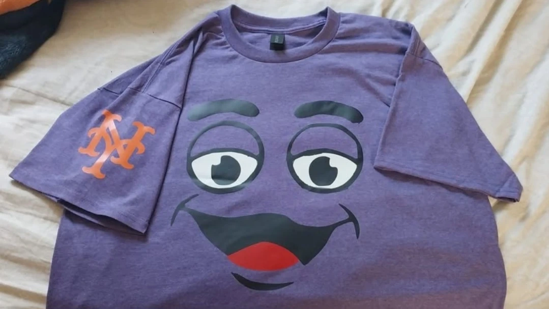 This purple t-shirt features a fun Grimace-inspired face graphic on the front. It also includes the New York Mets logo on the sleeve. It's a unique graphic tee!