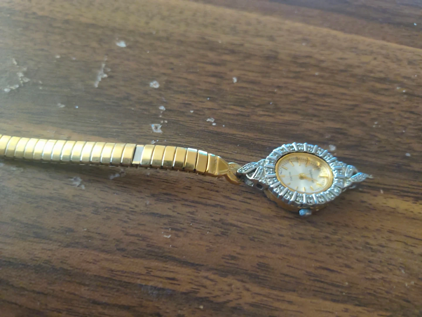 A gold-tone watch featuring a round, white dial with crystal accents around the bezel. It has a flexible, segmented band. This watch is a quartz movement timepiece.