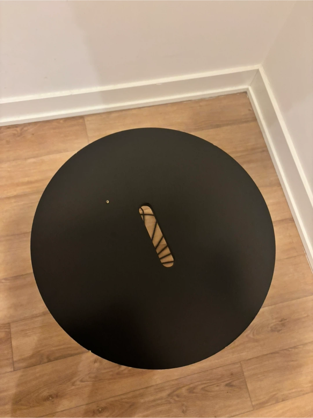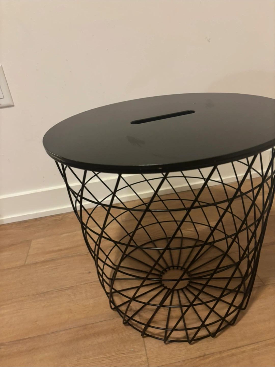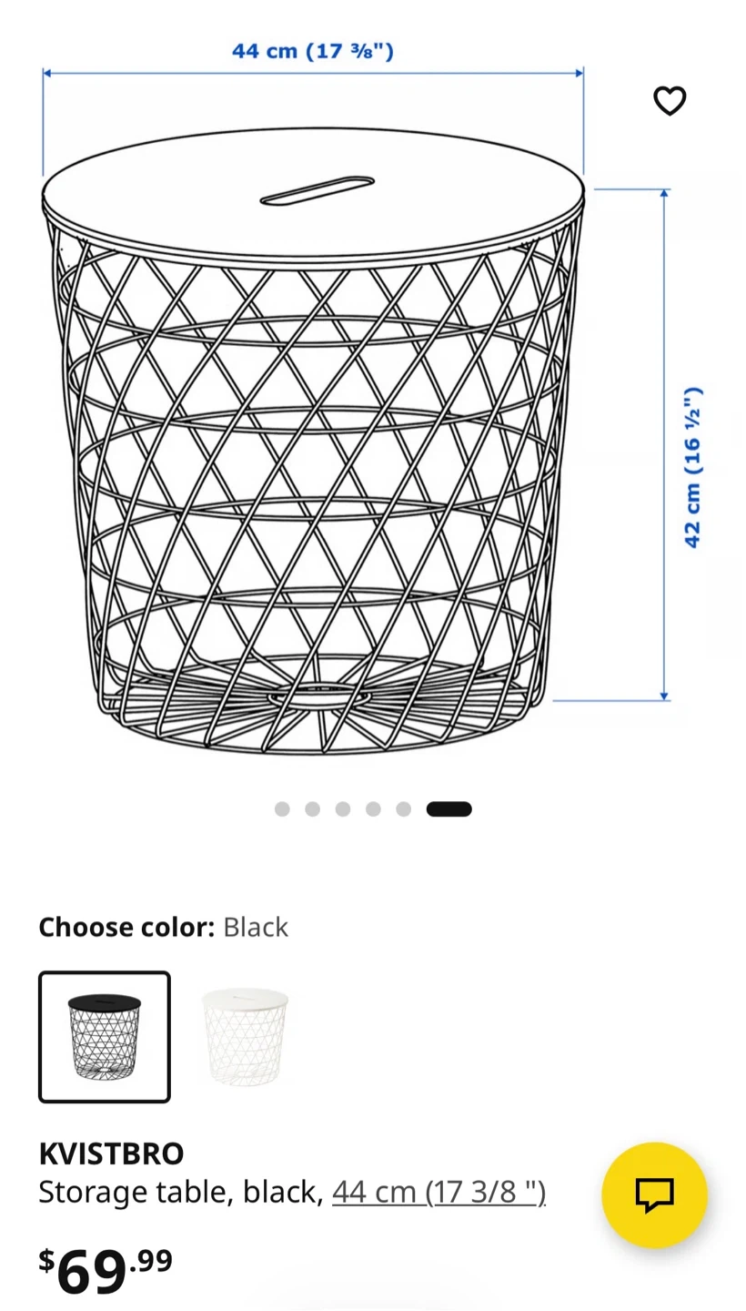 This black IKEA KVISTBRO is a stylish storage table. It has a lid and a metal wire basket base. Diameter is 44 cm and height is 42 cm. It's great for keeping things tidy!