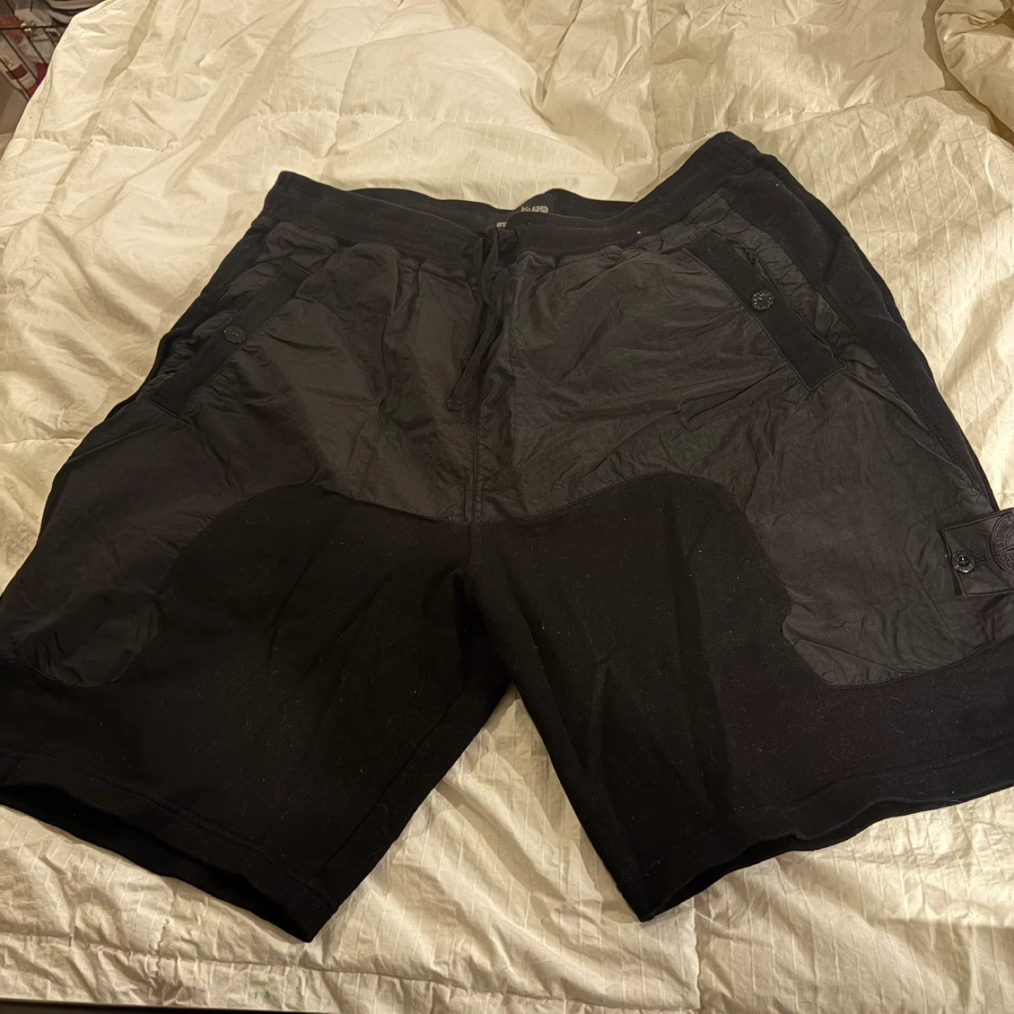 Authentic Stone Island Shadow Project Mixed Fabric Cargo Bermuda Shorts in Black. Features a sophisticated panelled construction combining technical materials with a comfortable cotton base.