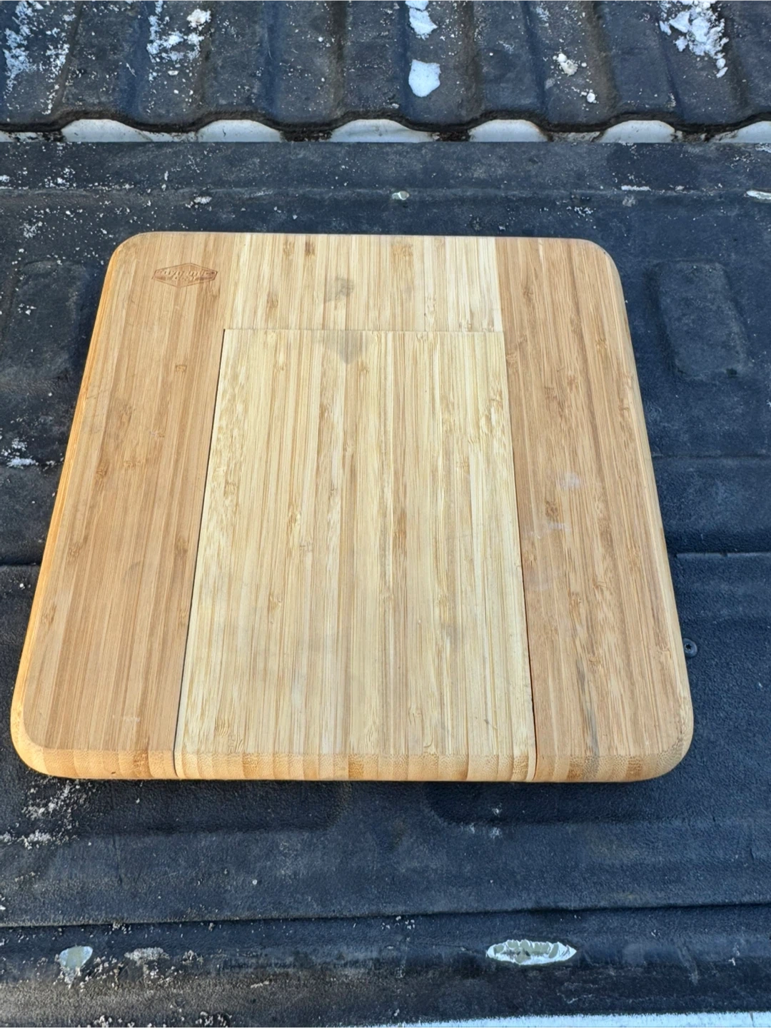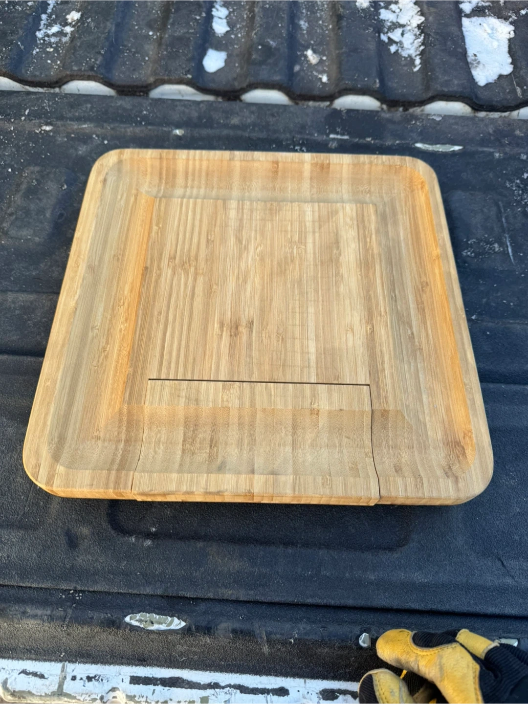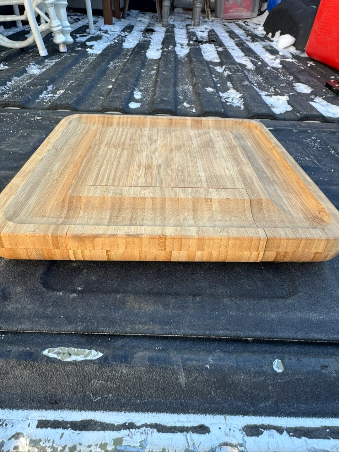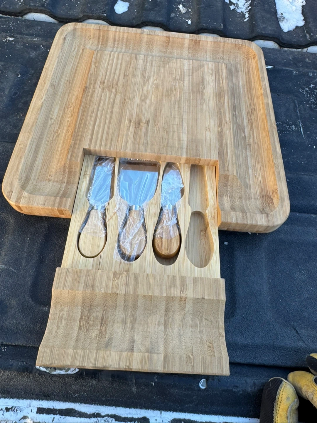 This Dynamic Gear cheese board is made from bamboo and includes a pull-out drawer with three cheese utensils. It's perfect for serving cheese or charcuterie. The board has a routed edge and a juice groove.