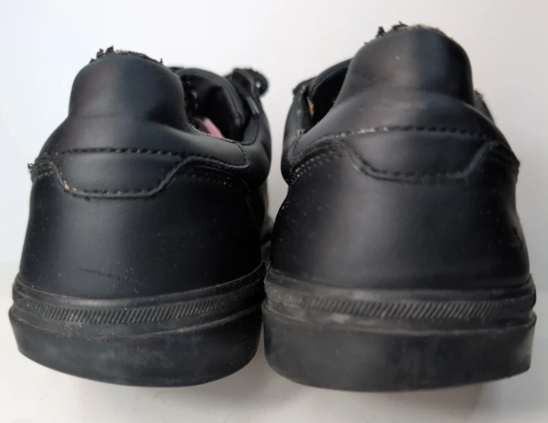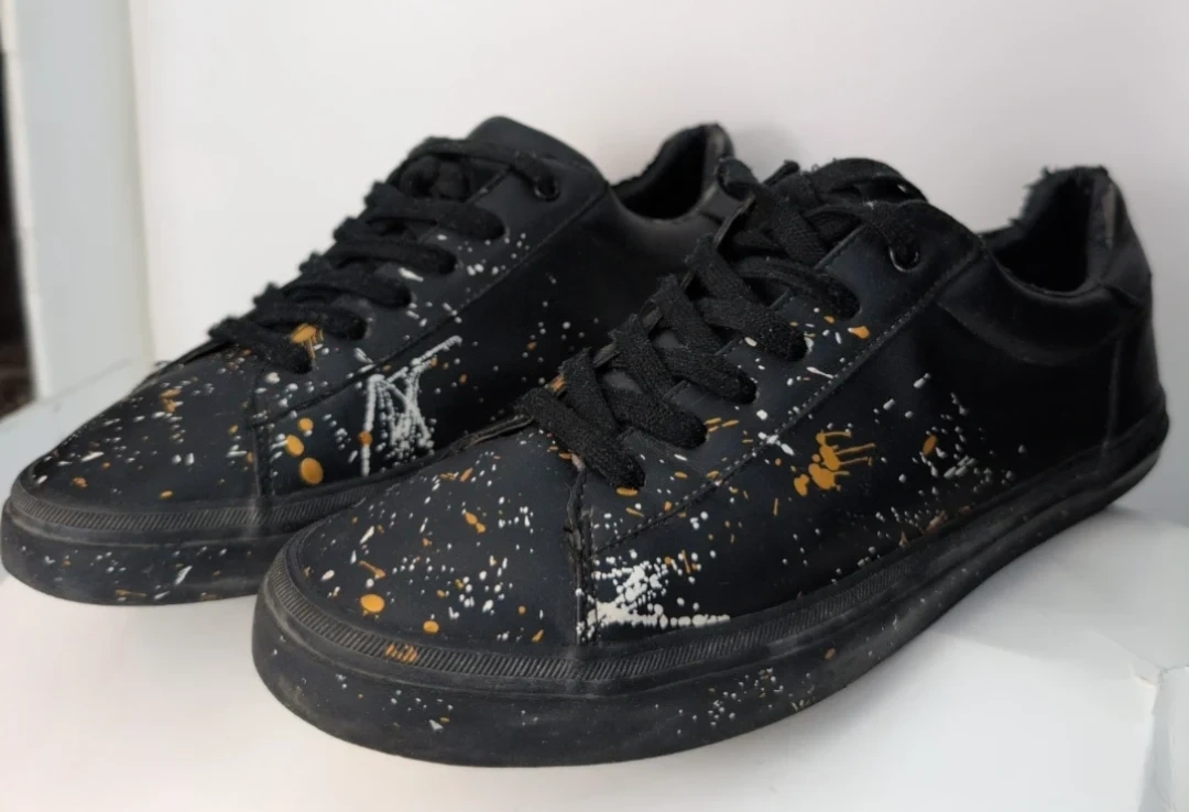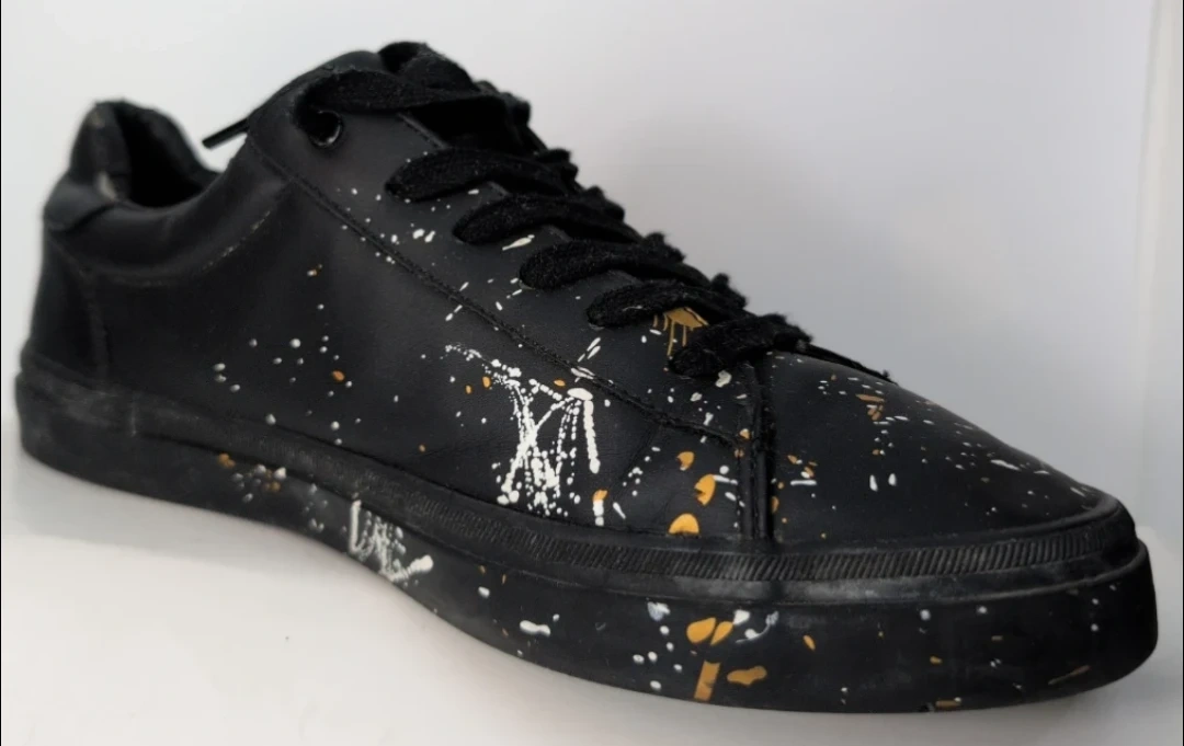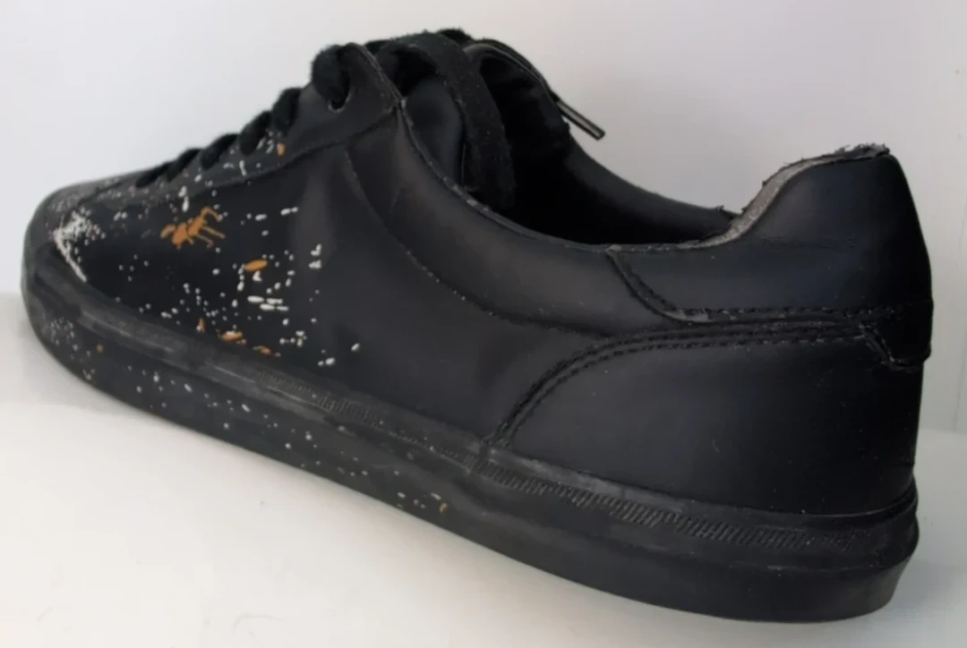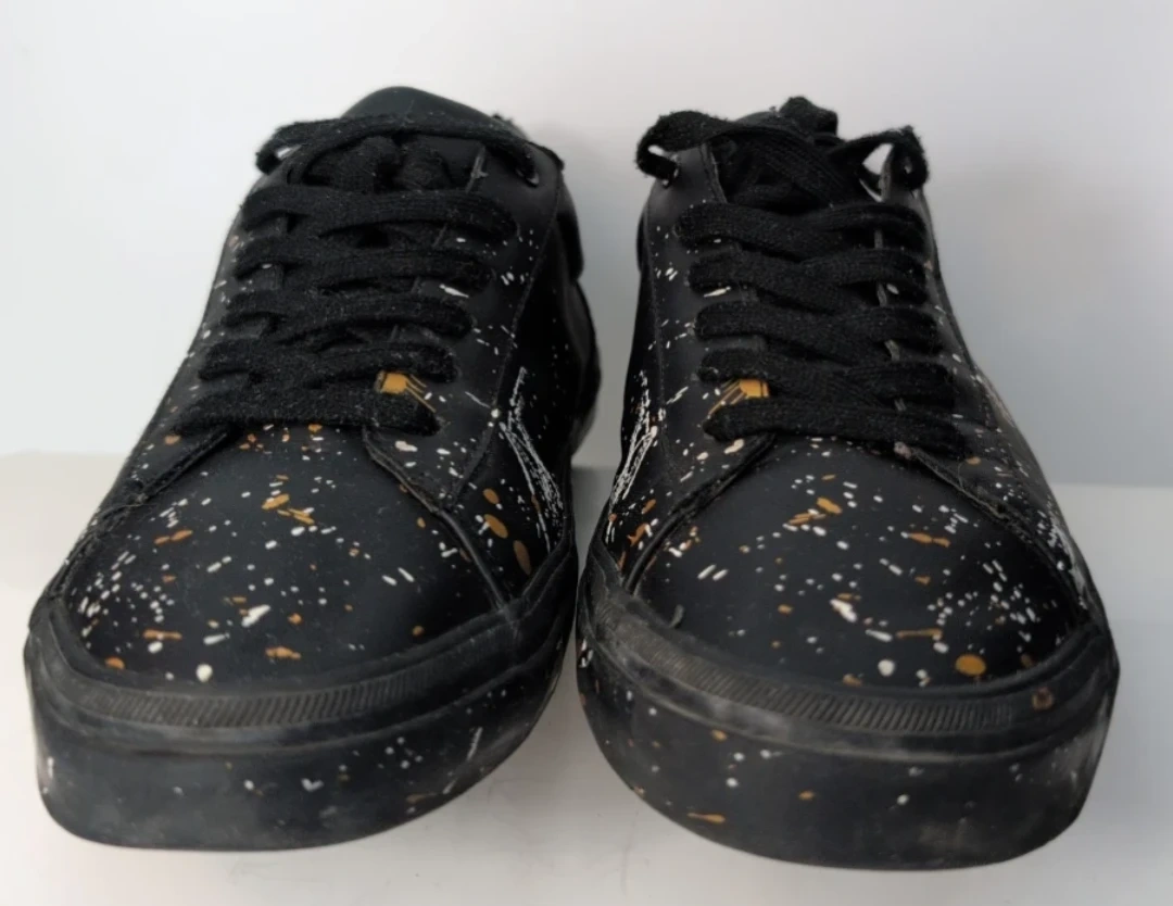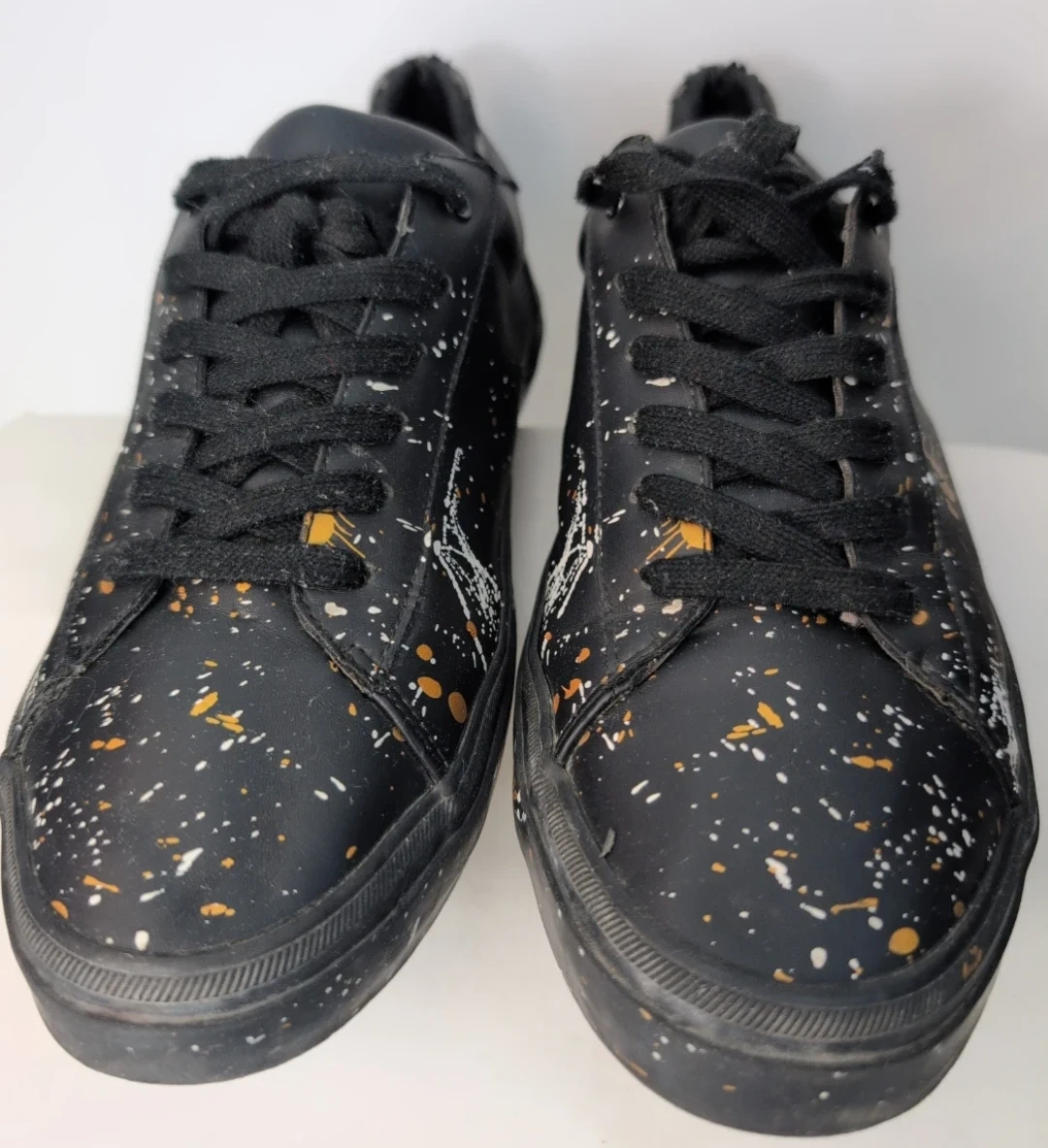 Stylish black low top sneakers featuring a unique white and gold splatter design. They have a classic lace-up closure. These are casual shoes that add a bit of flair to any outfit.
