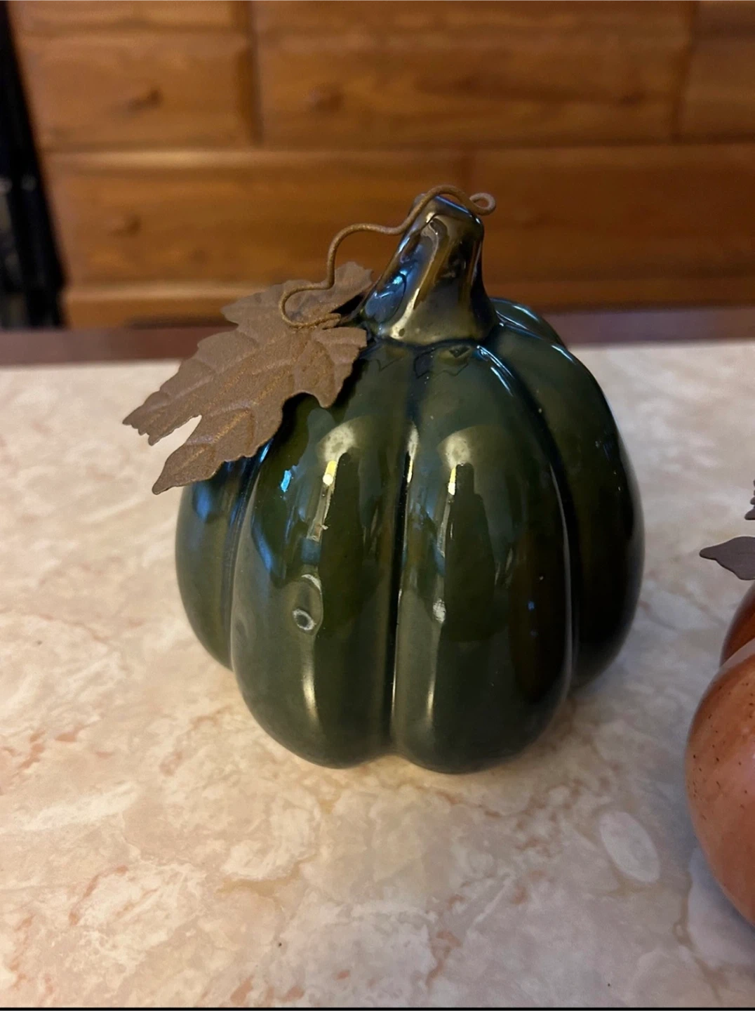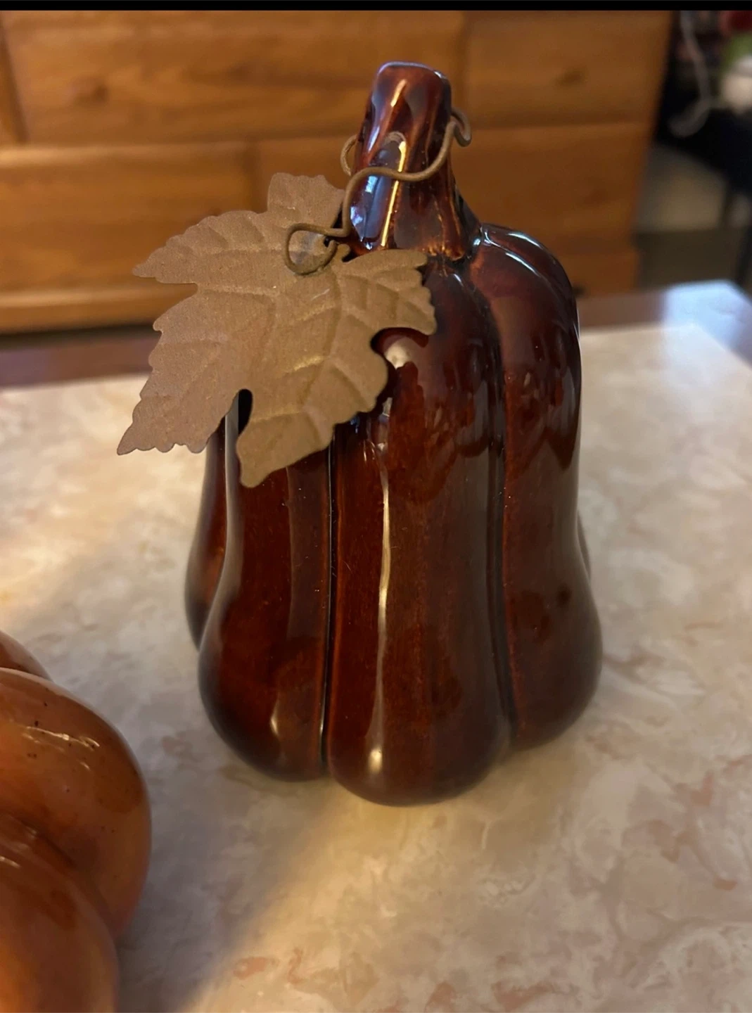 Add a festive touch to your home with this set of three ceramic pumpkins. Each pumpkin has a glossy finish and a decorative metal leaf accent. They're perfect for fall decor!