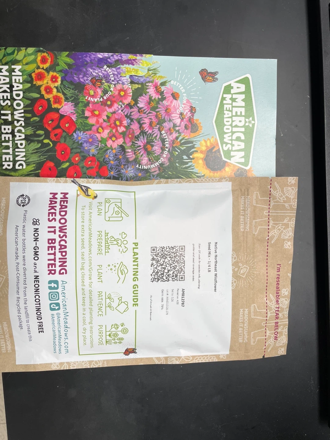 Selling a bag of American Meadows Native Northeast Wildflower Seed Mix - 1/4 LB. It's a mix of annuals and perennials. The package includes a planting guide to help you prepare, plant, and care for the seeds. It is non-GMO and neonicotinoid free