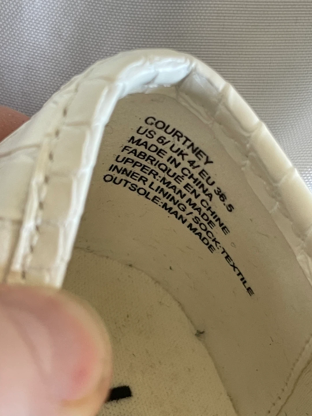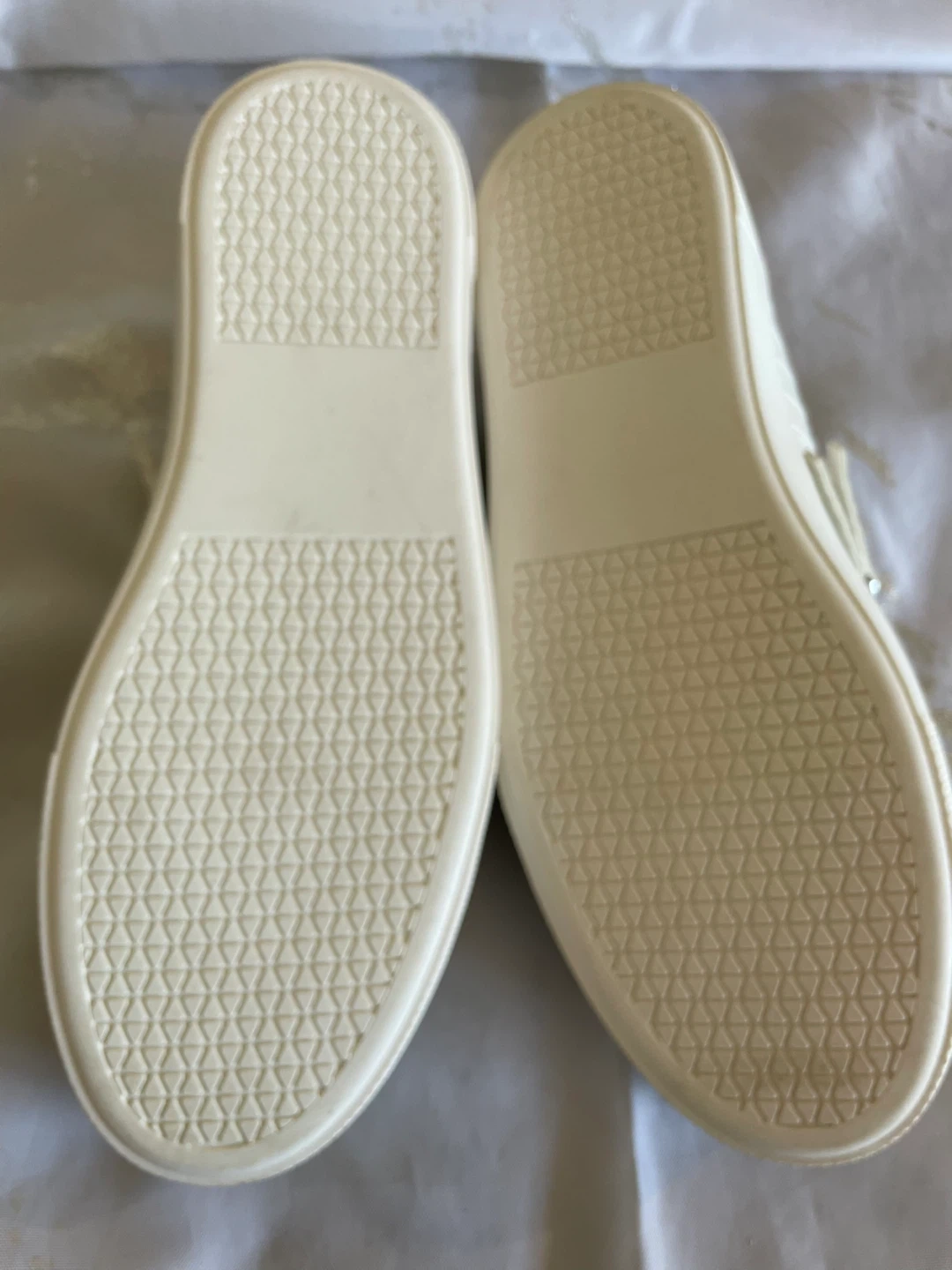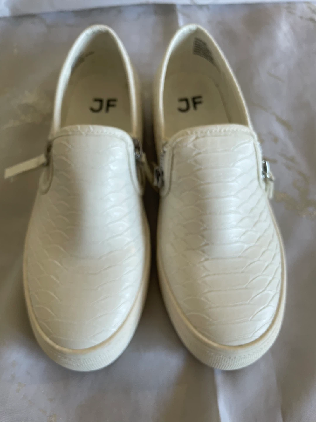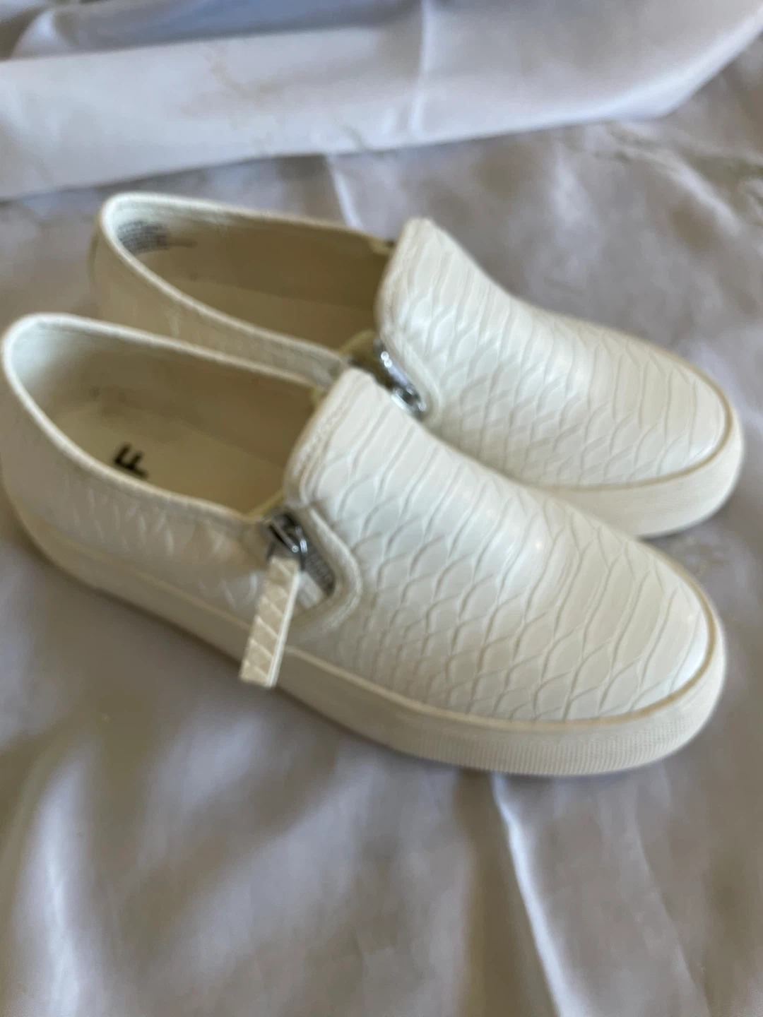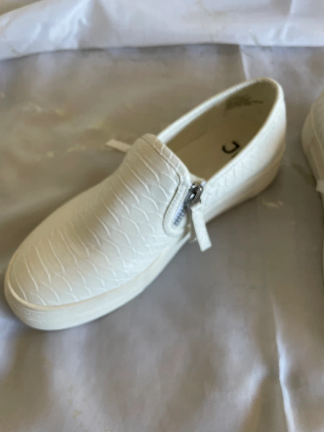 White croc embossed slip-on sneakers. US size 6, UK size 4, EU size 36.5. Man-made upper, inner lining, and outsole. Features side zippers. These are from Avon and have never been worn