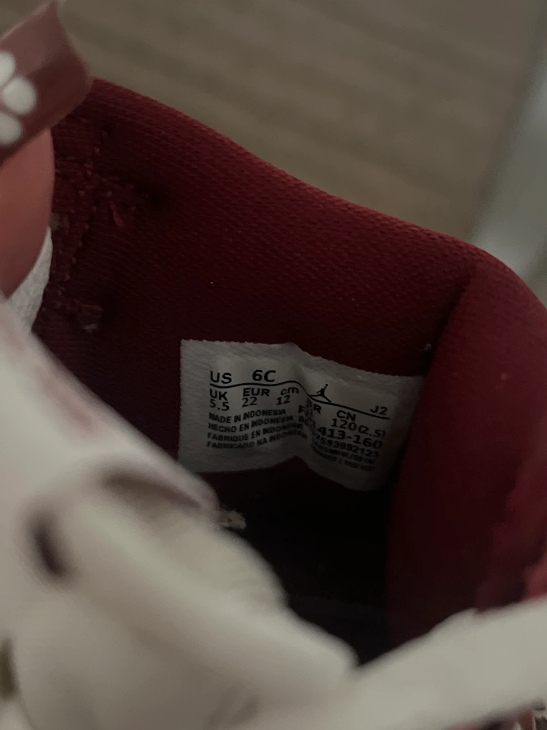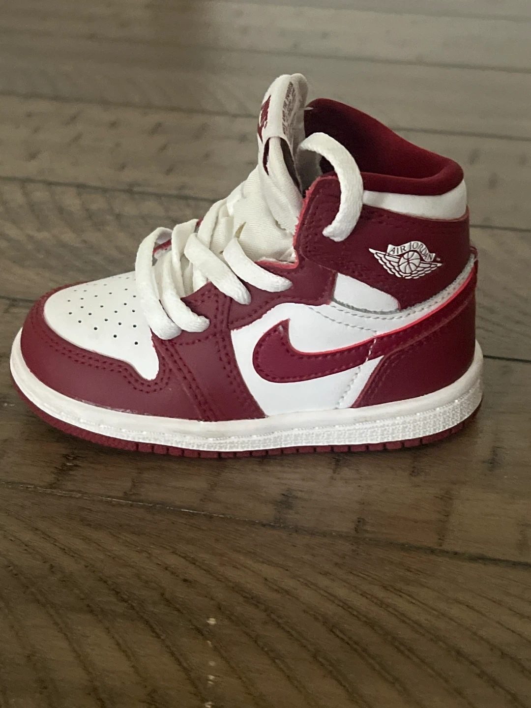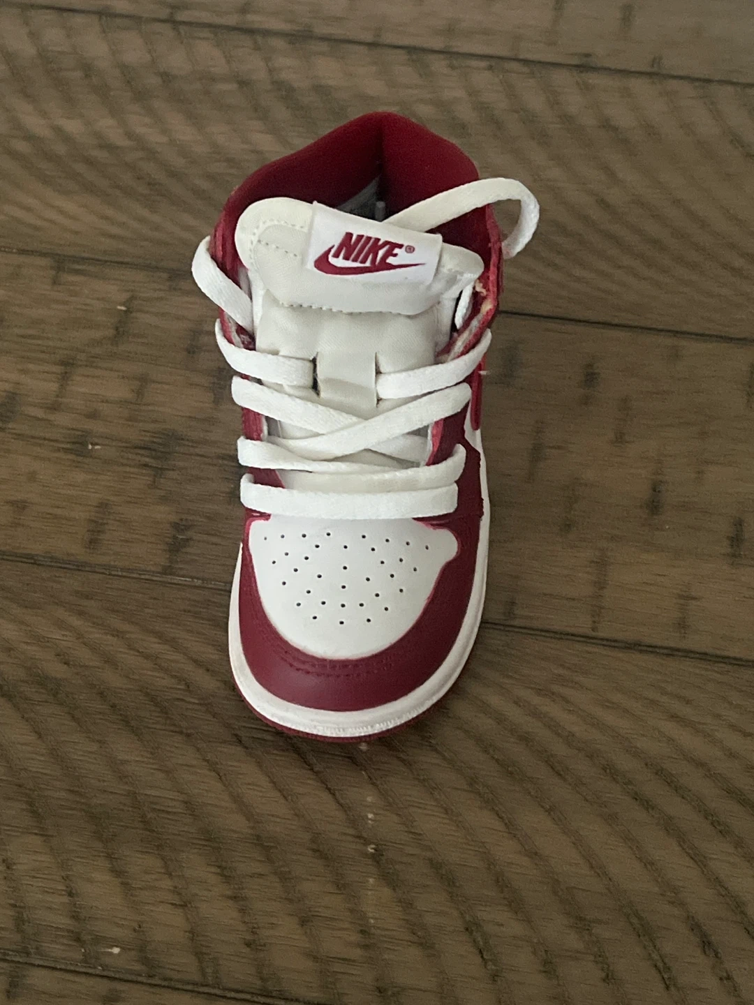 Adorable Nike Air Jordan 1 crib shoes in a classic red and white colorway. These little kicks feature the iconic Jordan Wings logo and Nike Swoosh. Perfect for your little one's first steps!