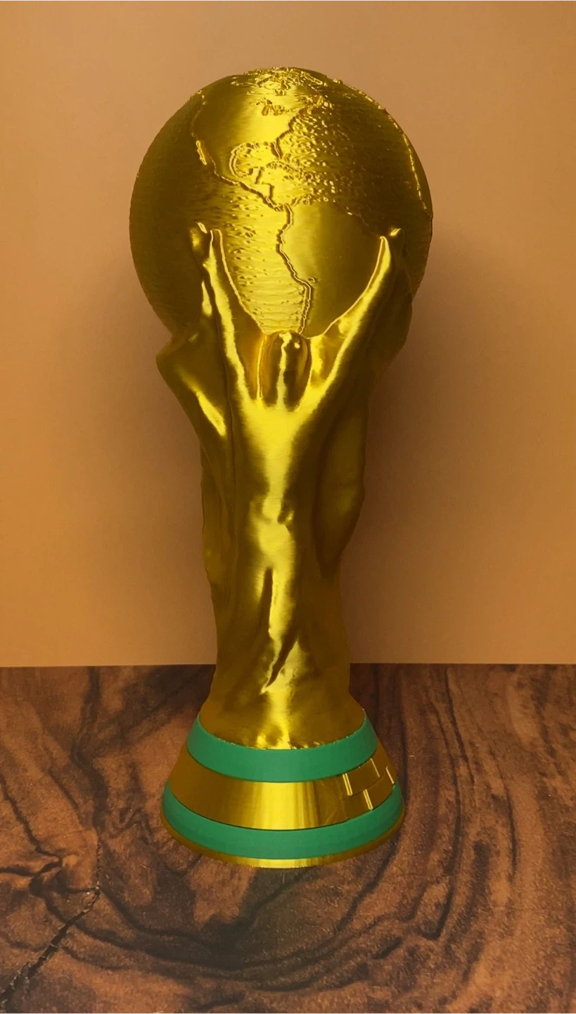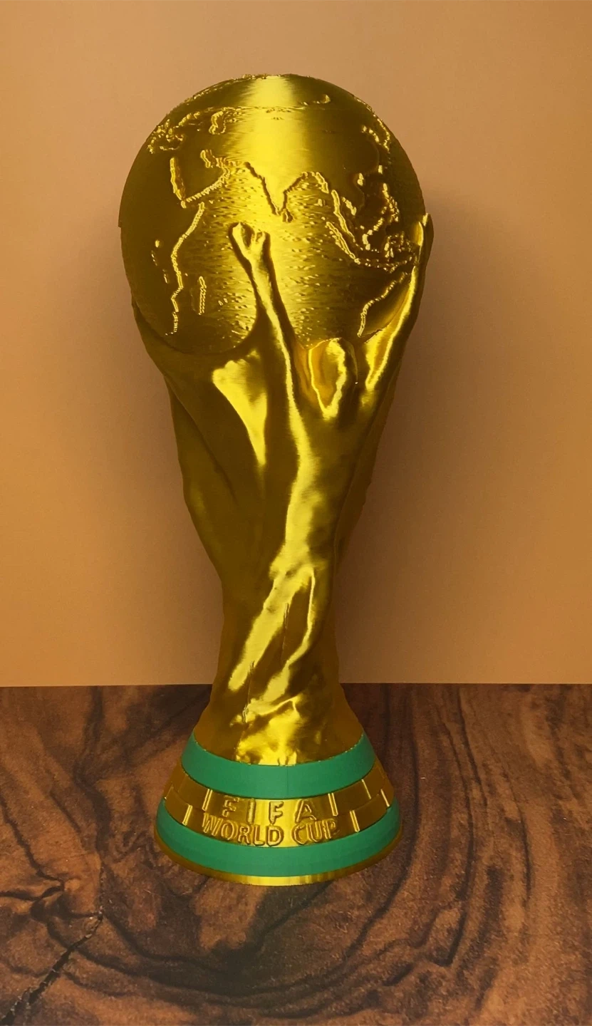 This is a replica of the FIFA World Cup trophy. It's gold-toned with a green and gold base. The base has text that reads 'FIFA WORLD CUP'.
