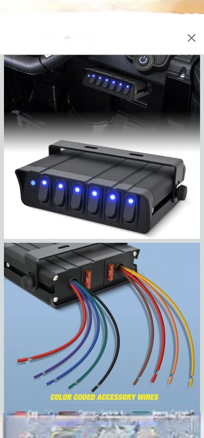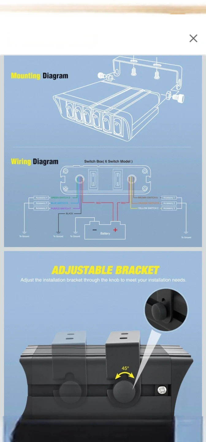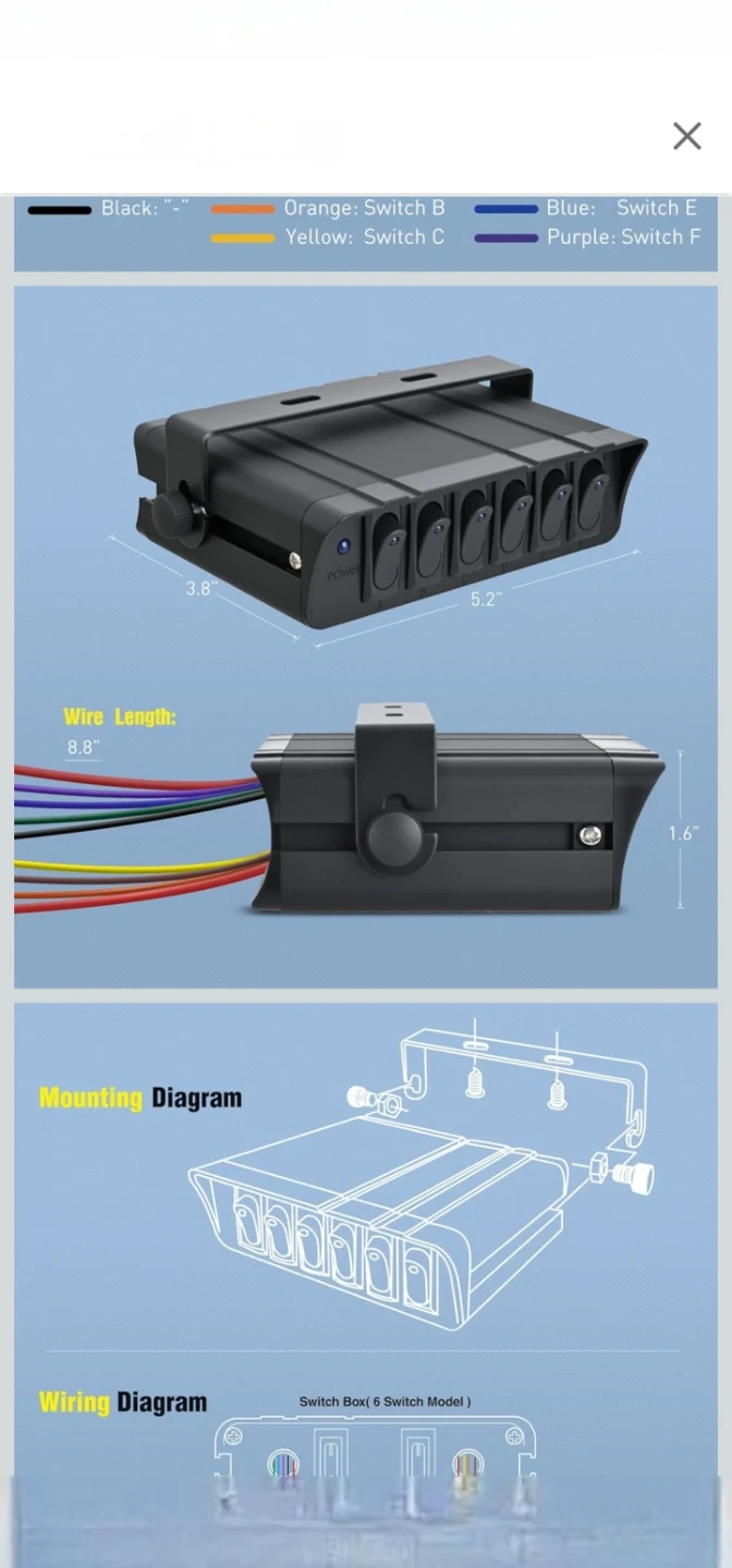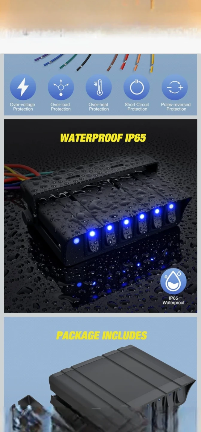 This is a rocker 6-switch relay system kit for controlling multiple accessories. It features over-voltage, over-load, over-heat, short circuit, and poles-reversed protection. The panel is waterproof with an IP65 rating and includes an adjustable mounting bracket. It's designed for easy wiring and installation in vehicles or other applications.