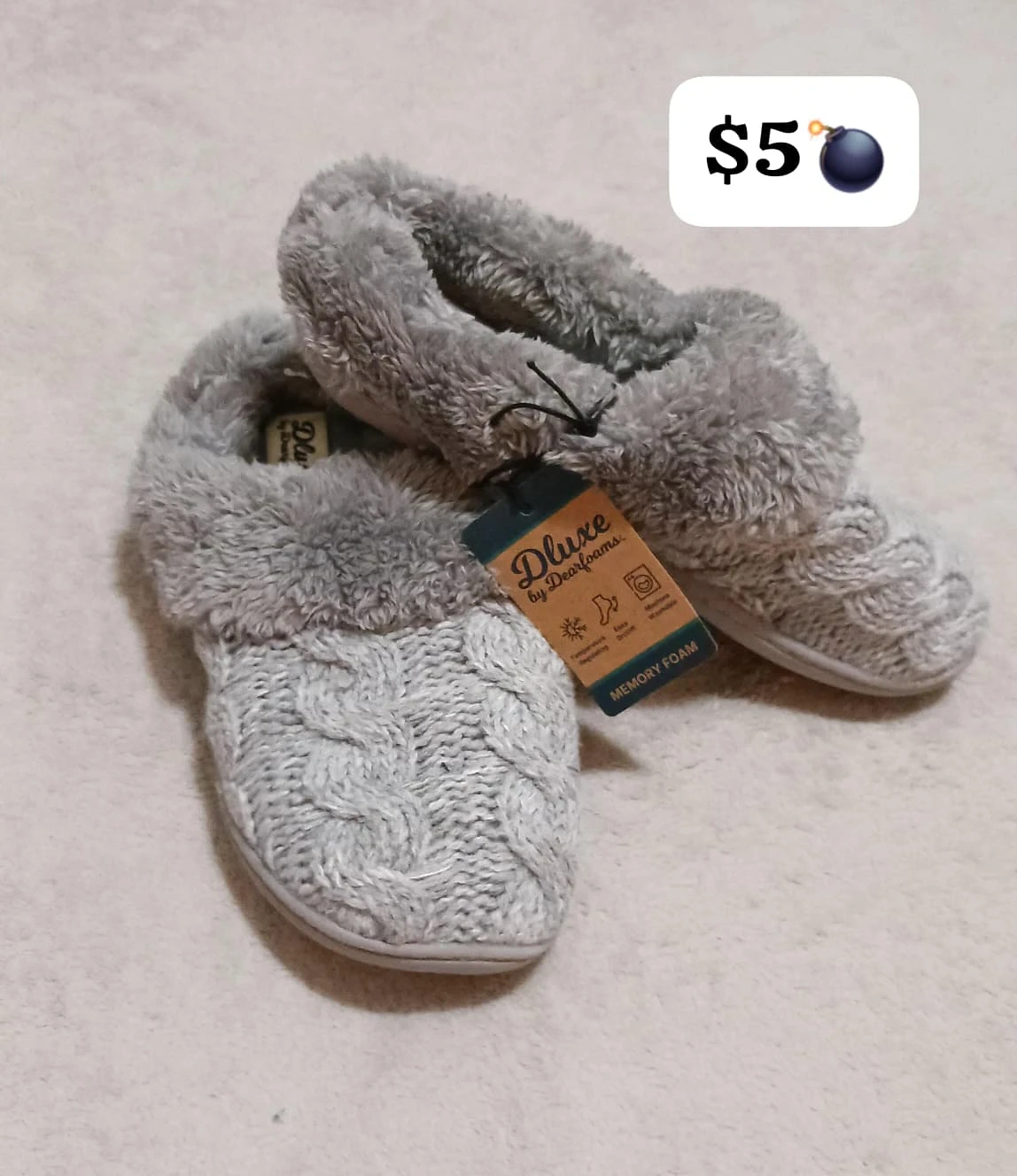 Cozy up with these Dearfoams DLuxe slippers! They're a lovely gray color and feature memory foam for extra comfort. The tag mentions they're machine washable, too! Perfect for keeping your feet warm and comfy around the house