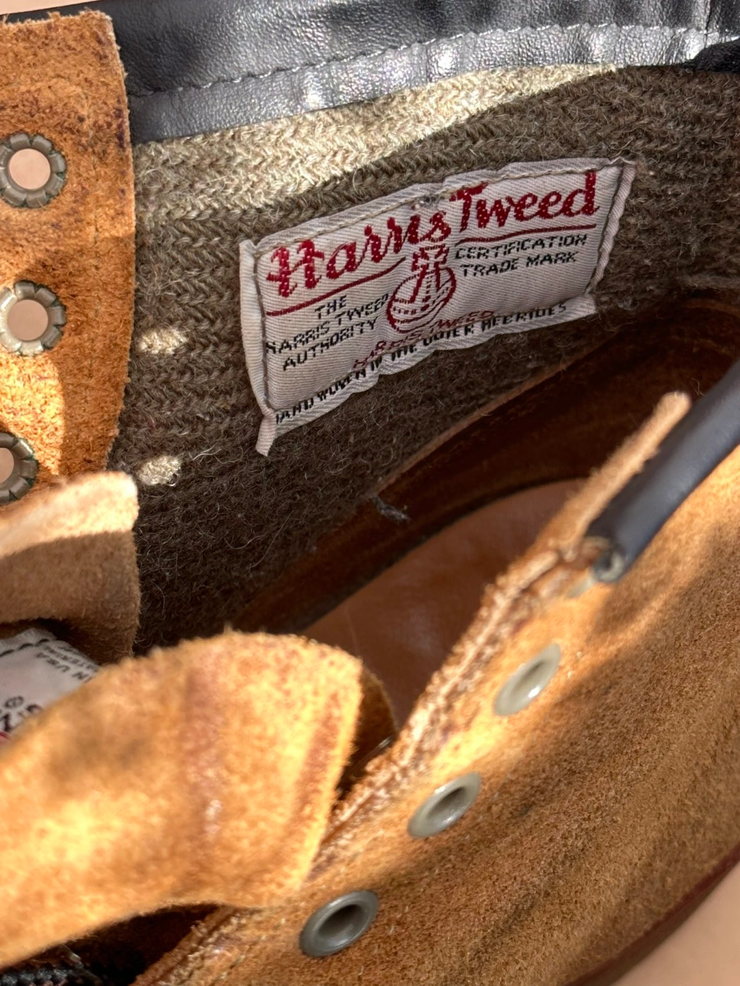Condition: Used in good condition, please refer to photos. These are a collaboration with a famous UK-based men’s fashion designer. The idea for these shoes derived from a vintage pair of WWI British Army boots Nigel Cabourn came across. Cabourn was totally mesmerized by this pair and wanted to replicate them with the quality standards of today. They are unique as the soles are super comfortable and they are partially lined with Harris Tweed, which offers warmth to the back and sides of your feet. Although this particular pair is factory second, I could not spot any manufacturer defects. The holes are punched in the folding area of the tongue, it’s very hard to spot.