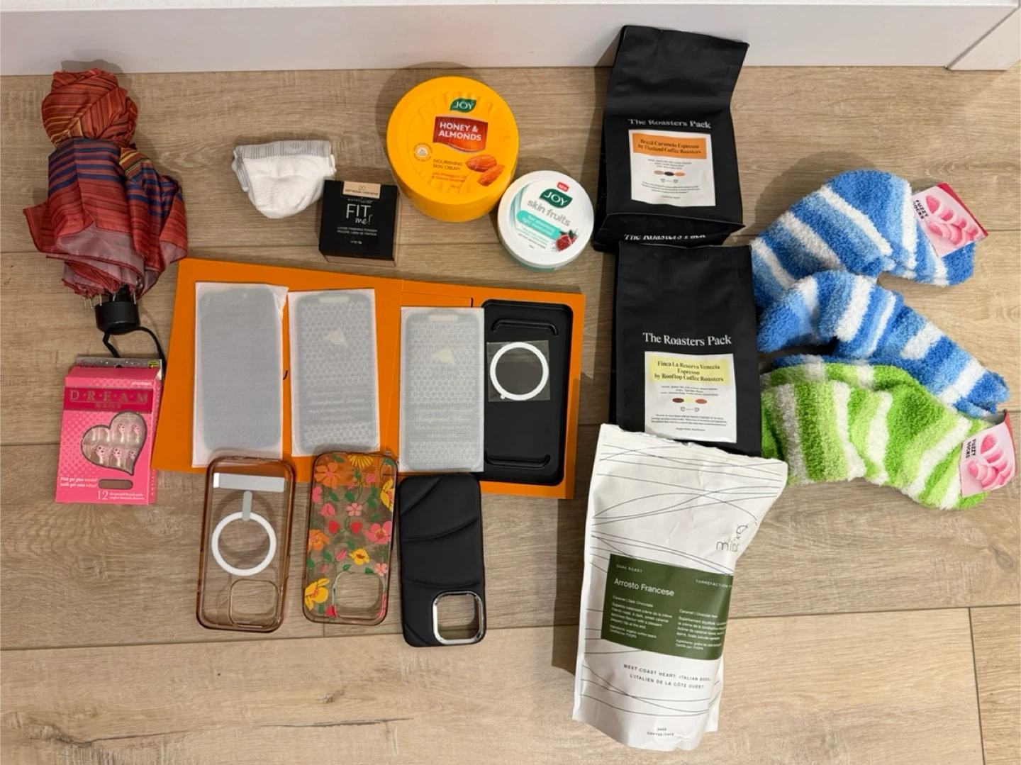 3 coffee bags, 3 fuzzy socks, umbrella and creams.