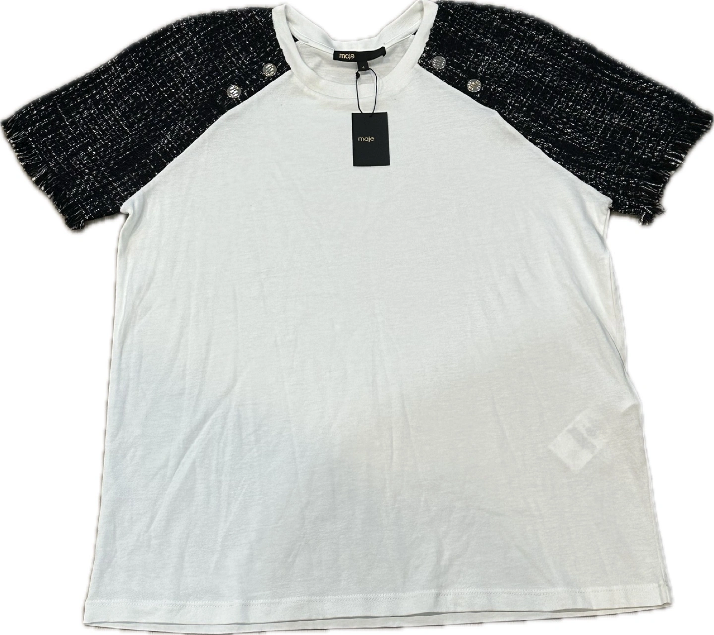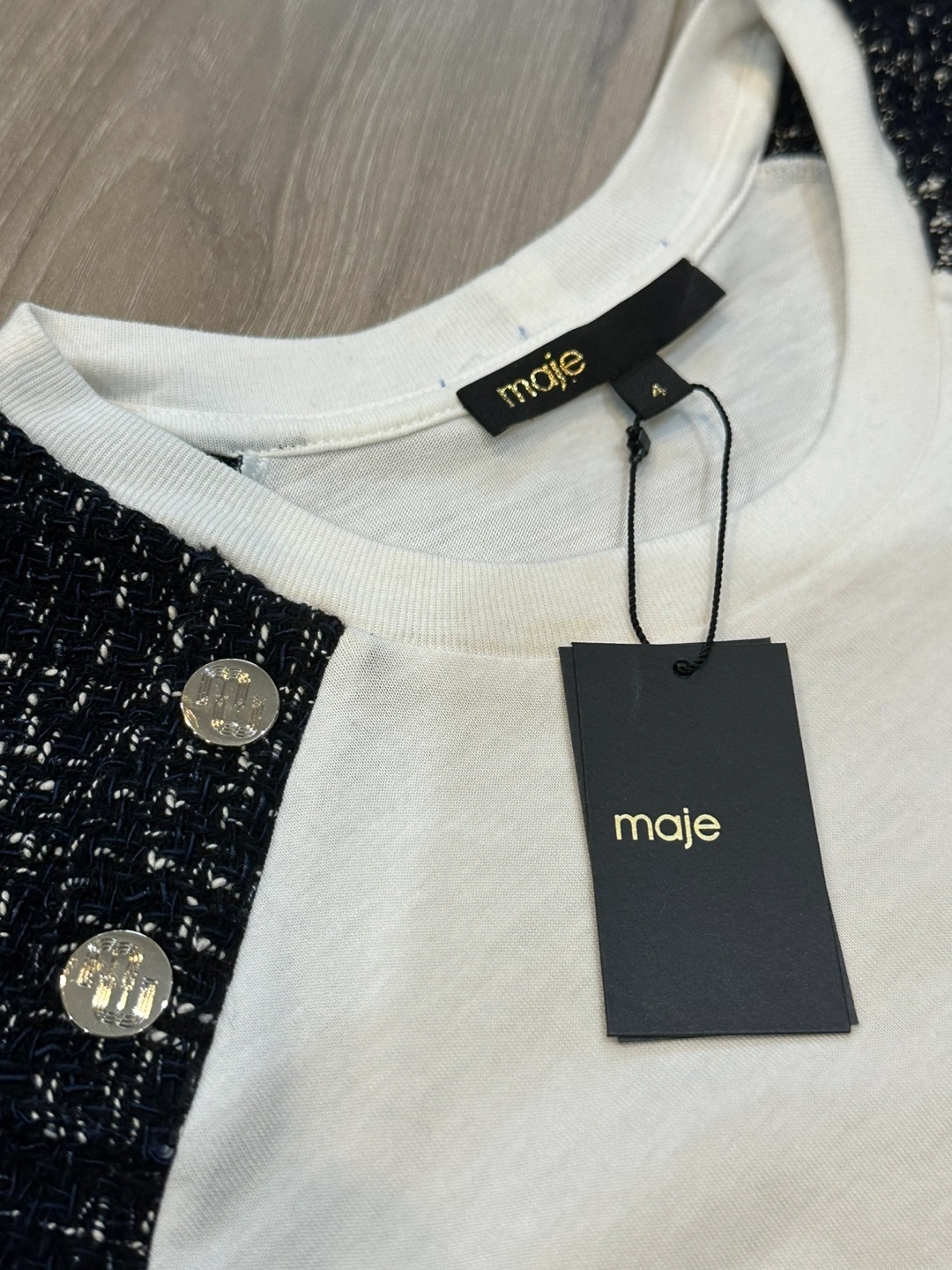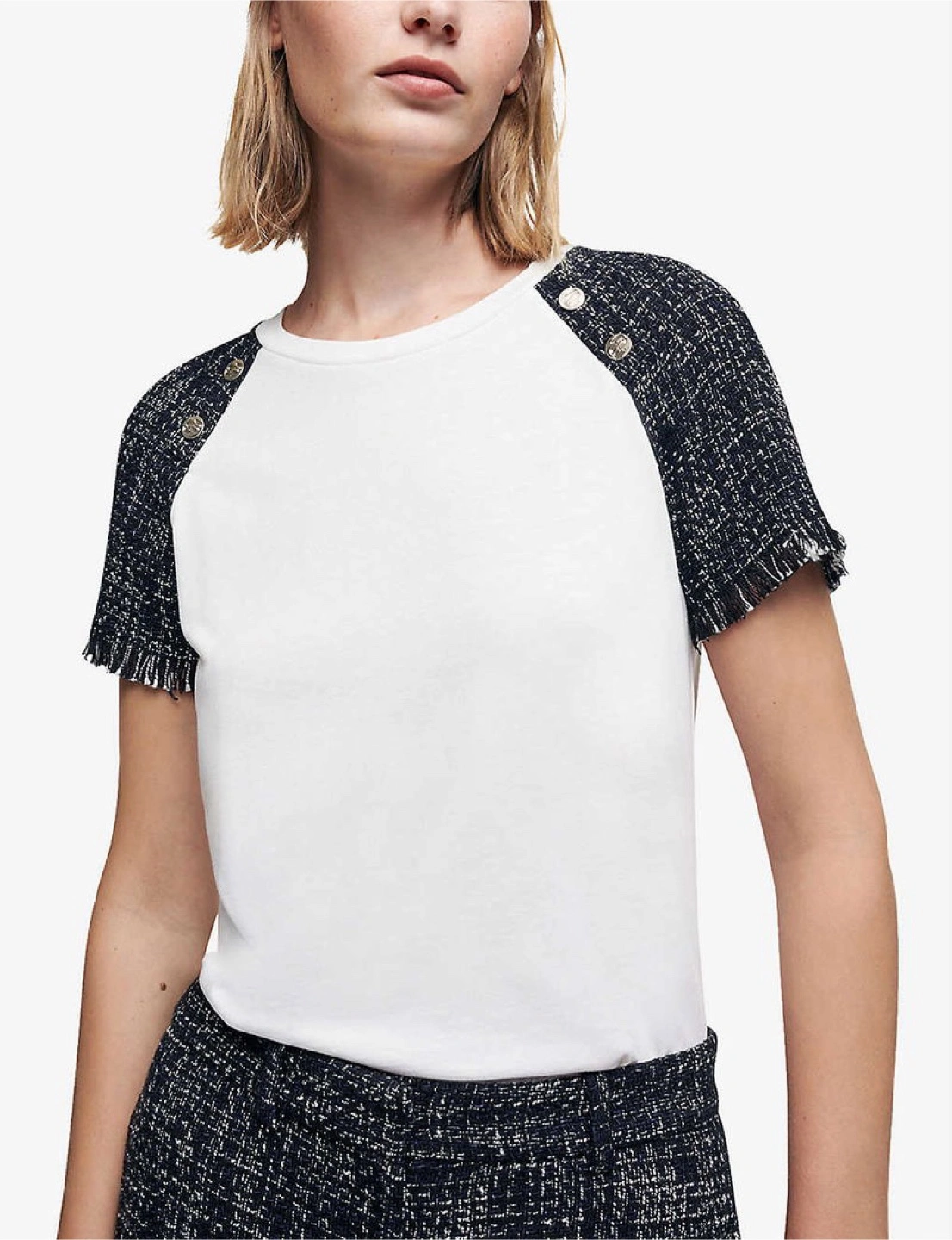 Maje Tiacome Tweed-Trim Semi-Sheer Woven T-Shirt