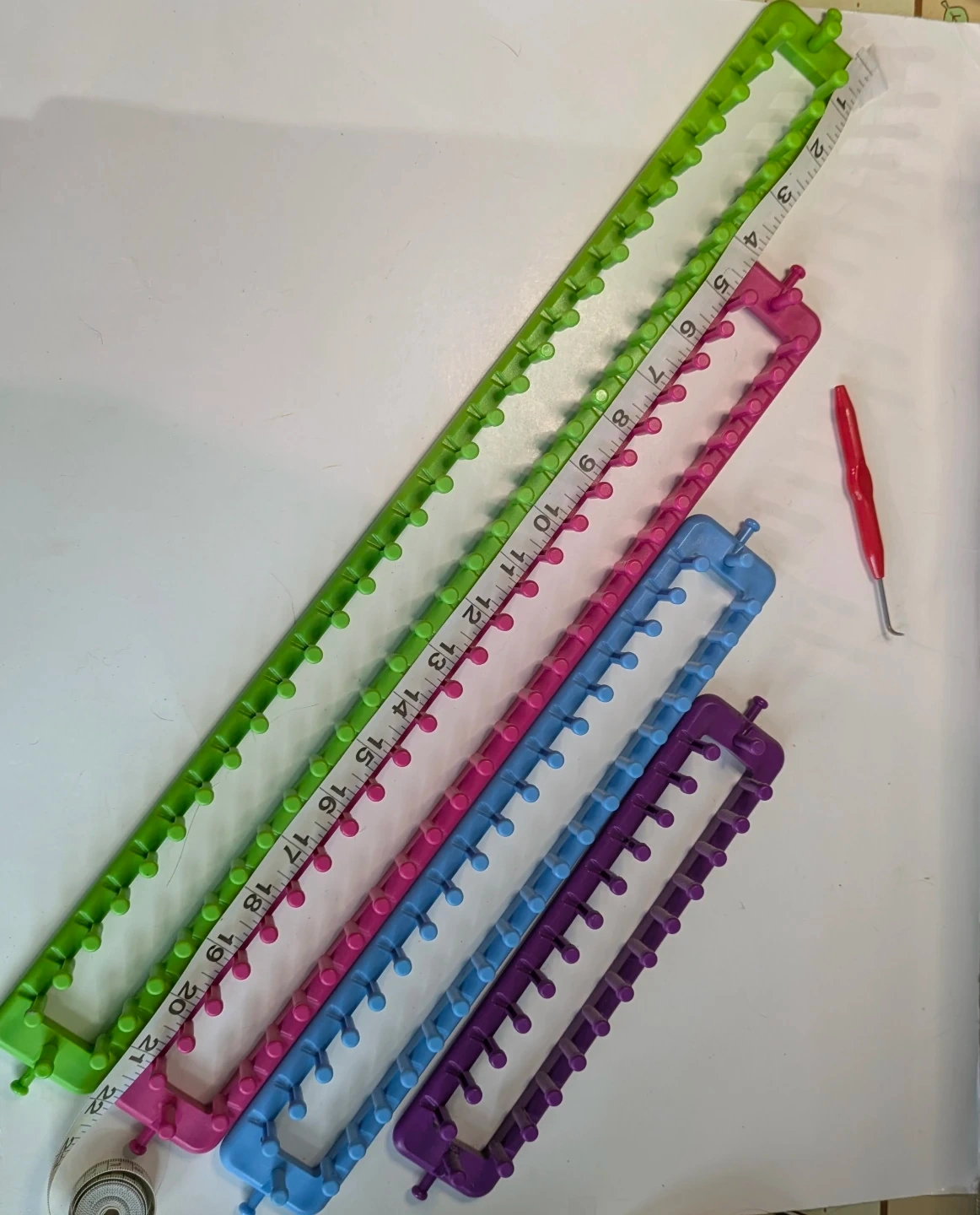 Four plastic knitting looms in green(22 in.), pink(18 in.), blue(13.5 in.), and purple(9.5 in.). Includes a red pick tool. These looms are for knitting projects such as scarves, table runners and baby blankets. If I have spare yarn, I'll throw it in as a bonus on pick up day!