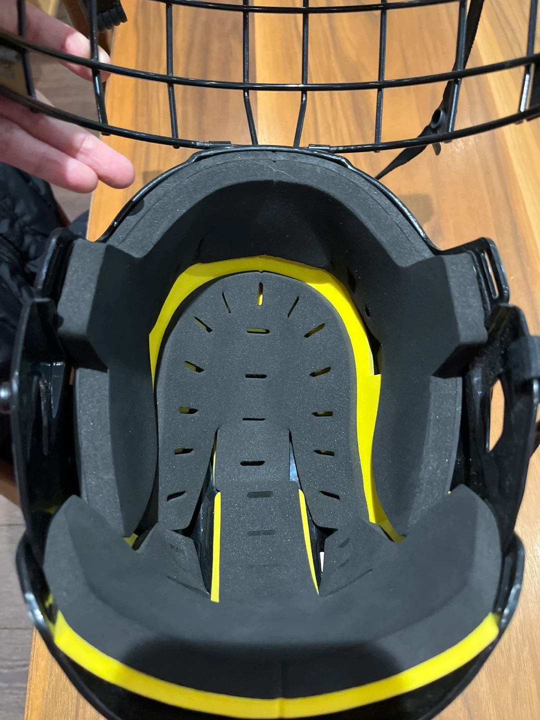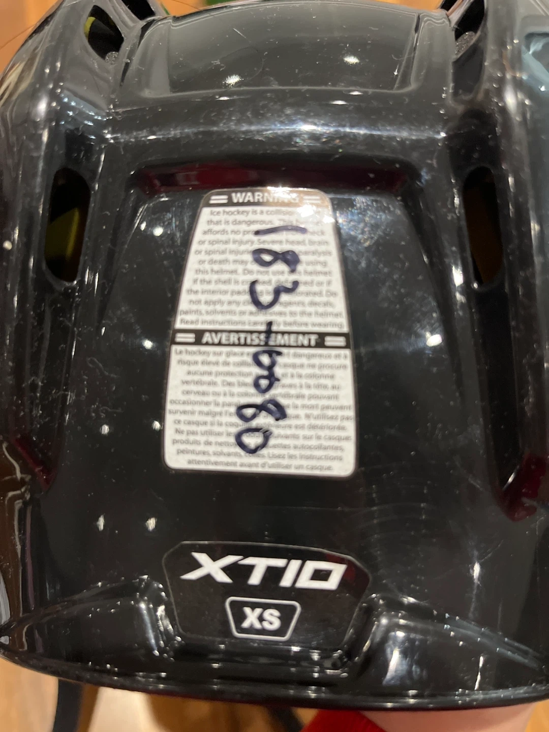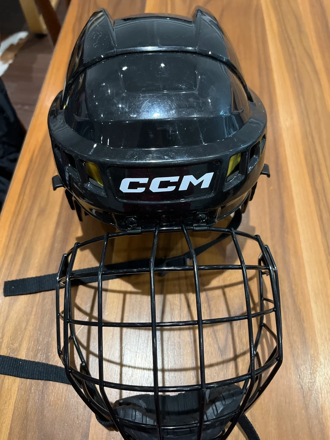 This is a black CCM XTIO hockey helmet. It's a size XS and includes a detachable face cage. The interior lining is yellow and black.