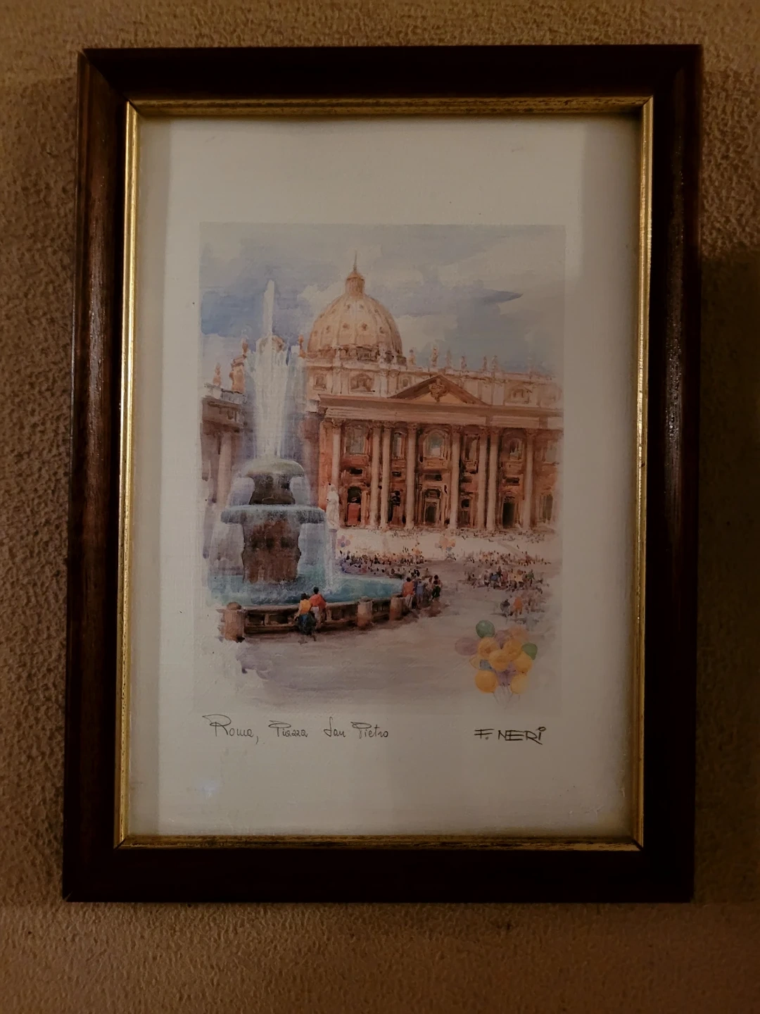 A framed print depicting St. Peter's Square in Rome with Bernini's fountain. The artwork is signed by the artist, 'F.NERI'. It's housed in a wooden frame with a gold inner border. Perfect for adding a touch of European charm to your home decor!
