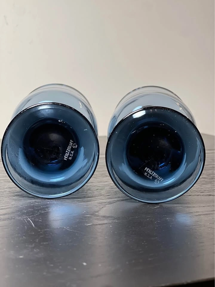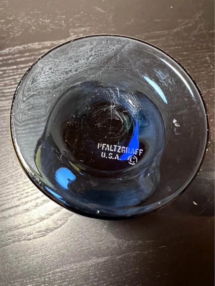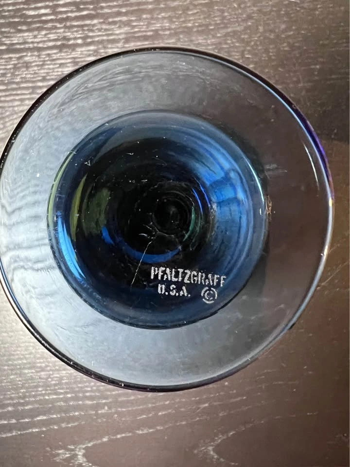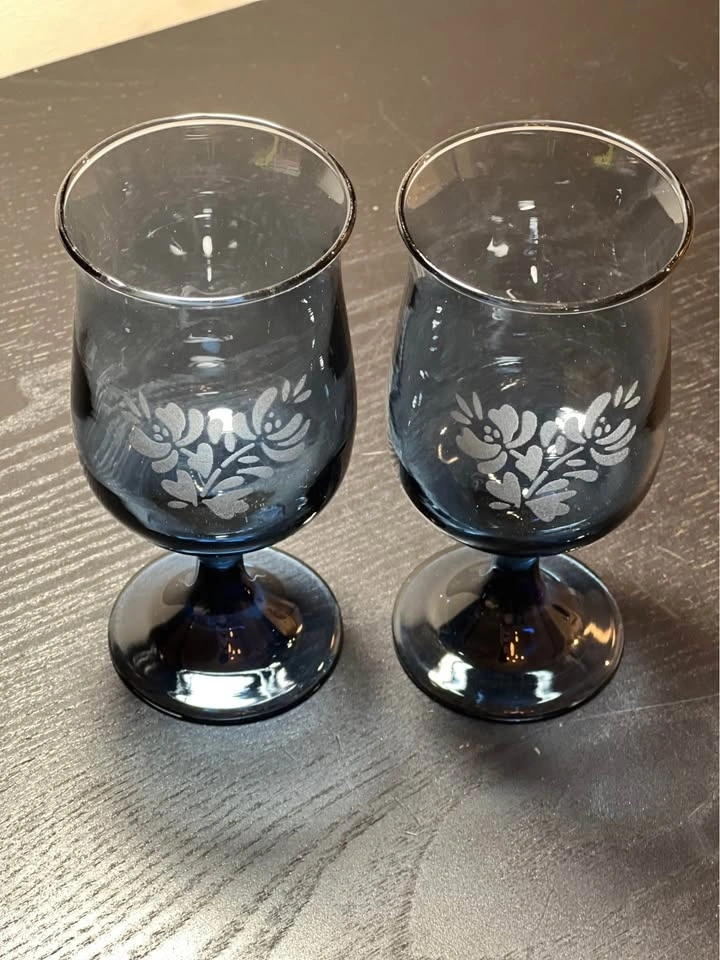 These are vintage Pfaltzgraff Yorktowne blue glass goblets with a white etched floral design. The pattern is part of the "Yorktowne" line, featuring a folk art-style floral motif. The glasses are made of blue-tinted, or "smoke blue," glass and stand about 5.5 inches tall. They hold around 8 ounces and are great for wine or water. The pattern was introduced in 1967 and is now discontinued. Pre-owned, sold as is. Pickup is at 58th and 7th Ave in Midtown Manhattan.