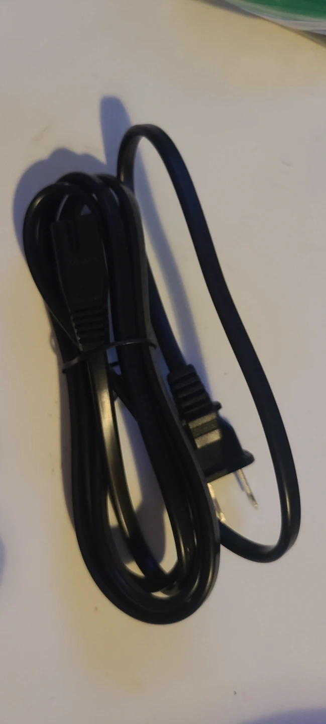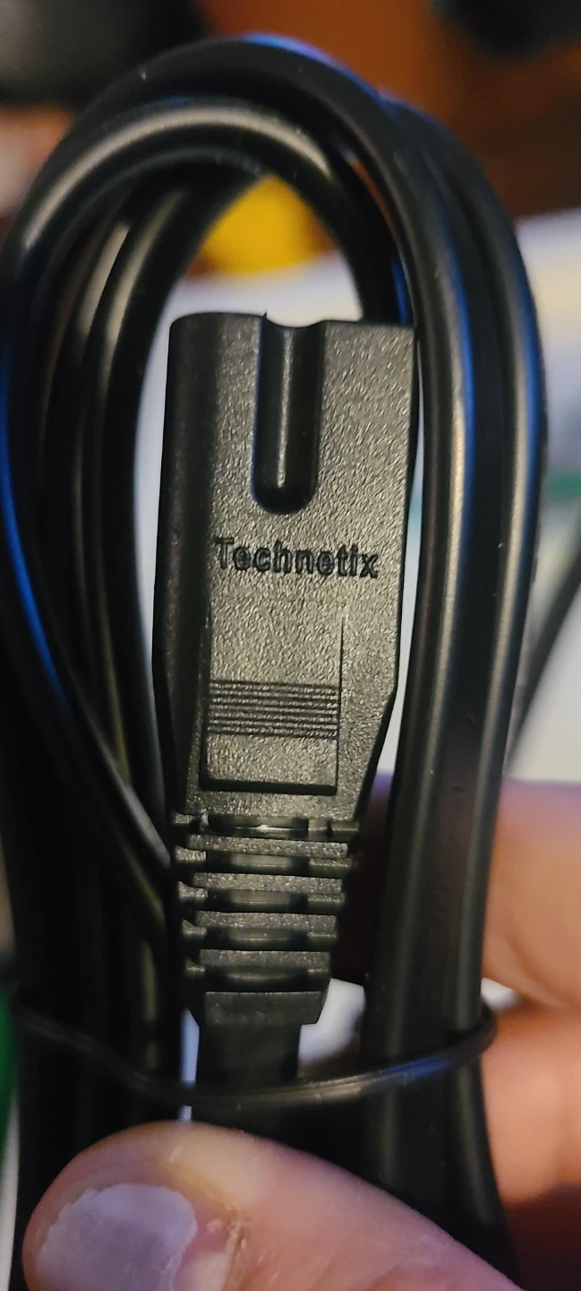 This is a black Technetix power cord. It has a C7 connector and a standard North American plug. It's approximately 6 feet long.
