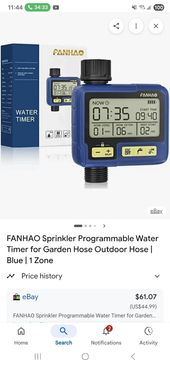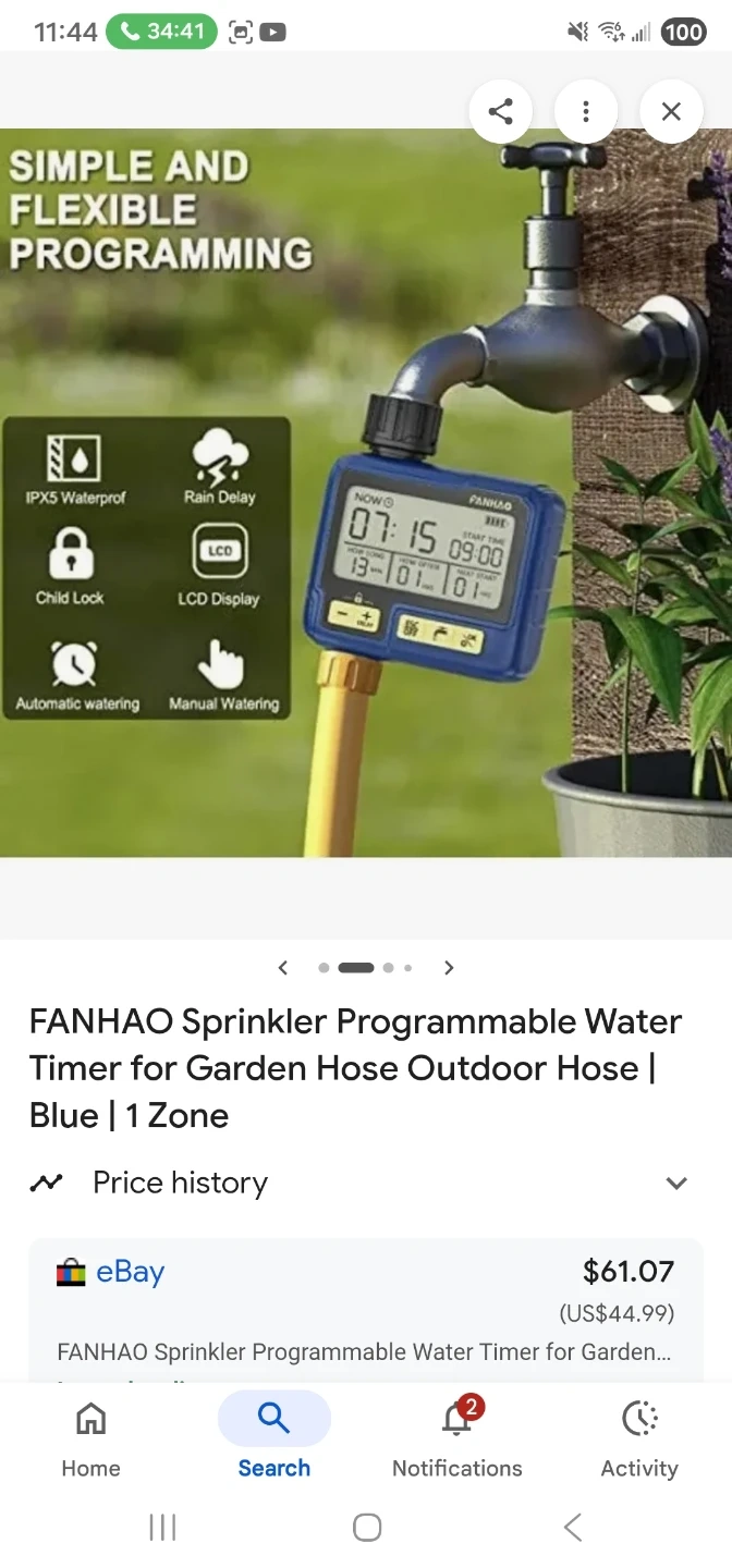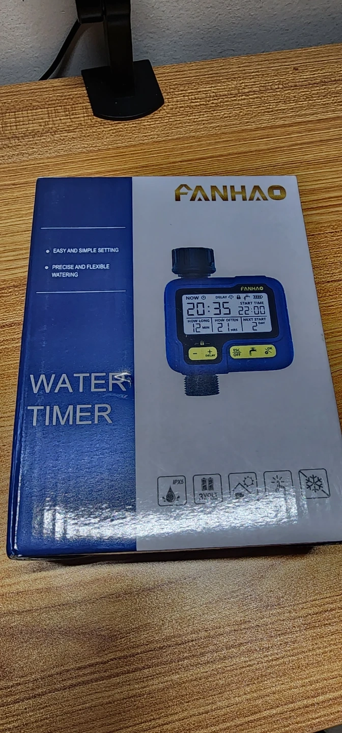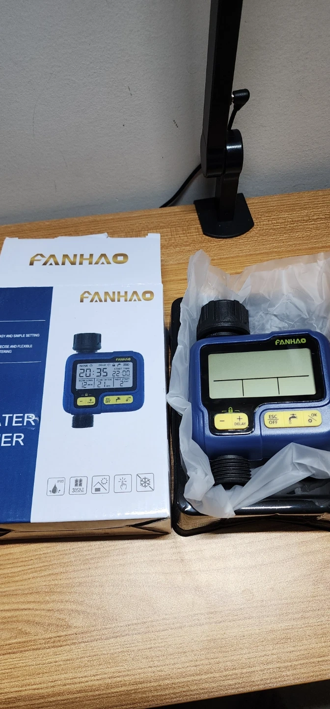 This FANHAO water timer connects to your garden hose for automatic watering. It offers easy and simple setting options with precise and flexible watering schedules. The device is IPX5 waterproof and powered by 2AA batteries.