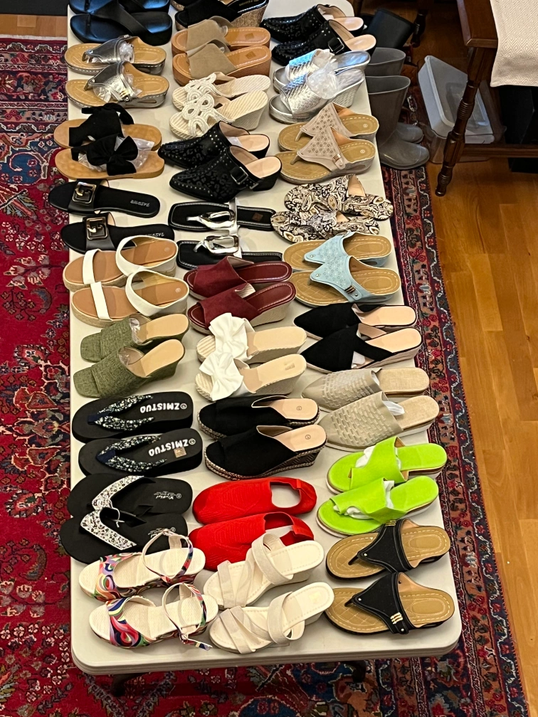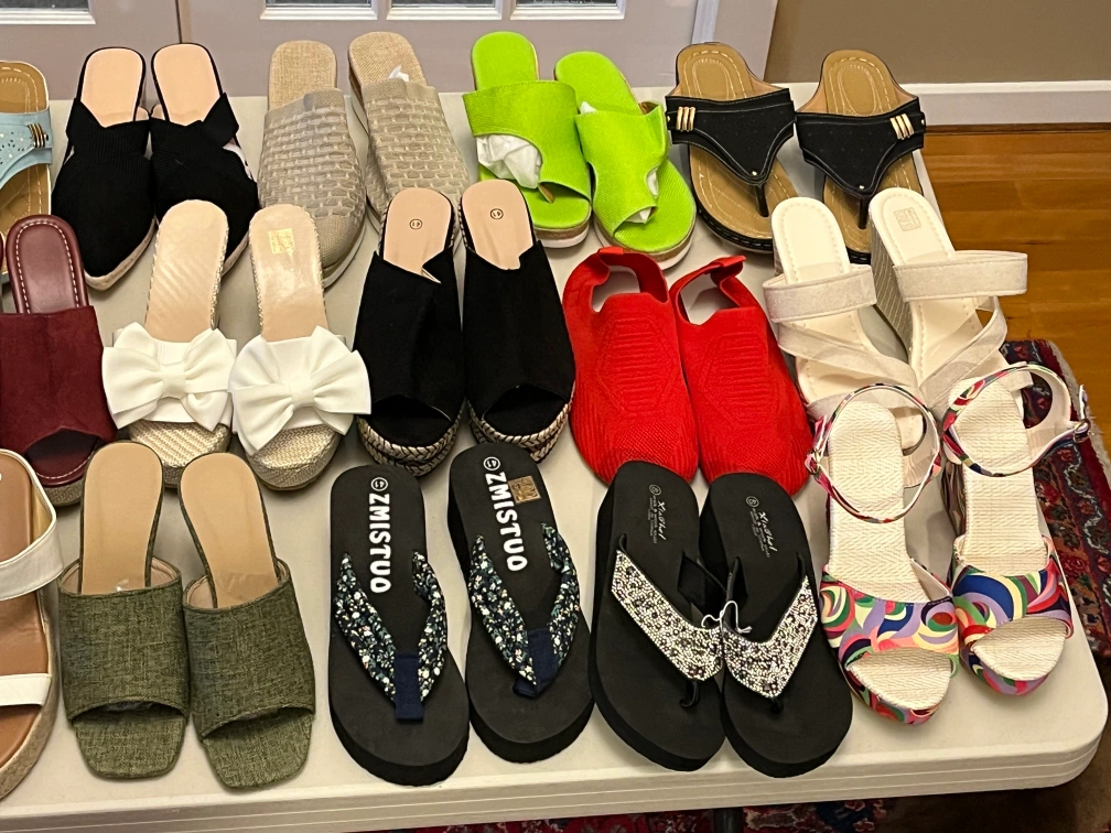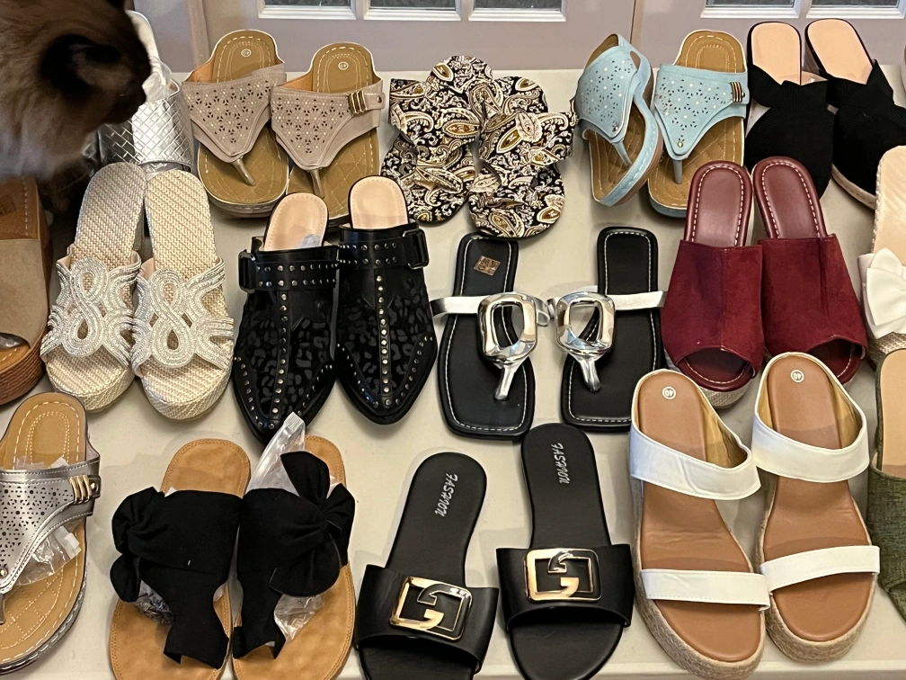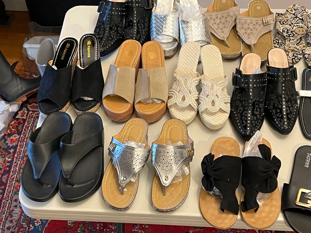 A variety of women's sandals, flip-flops, and slides. Includes wedge heels, flats, and casual styles in various colours and designs. These shoes are perfect for warm weather and casual outings.