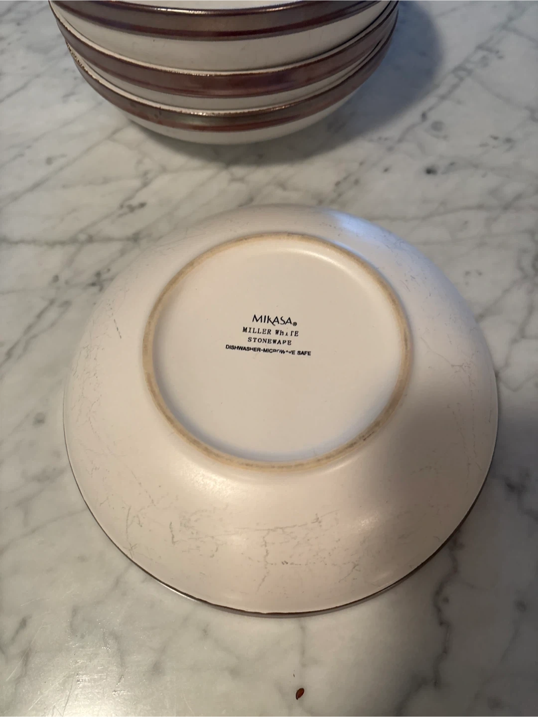 Selling a set of Mikasa Miller plates made of stoneware. These plates are dishwasher and microwave safe, perfect for everyday use! They have a stylish shape and design.