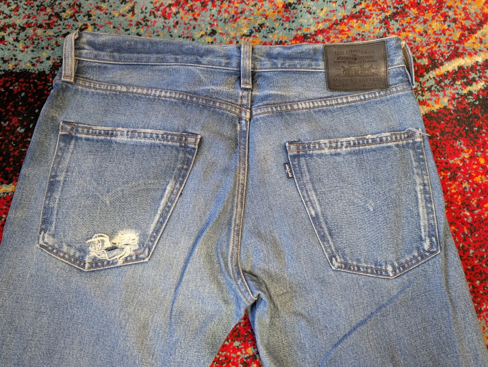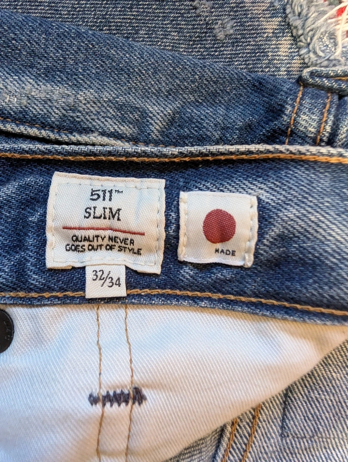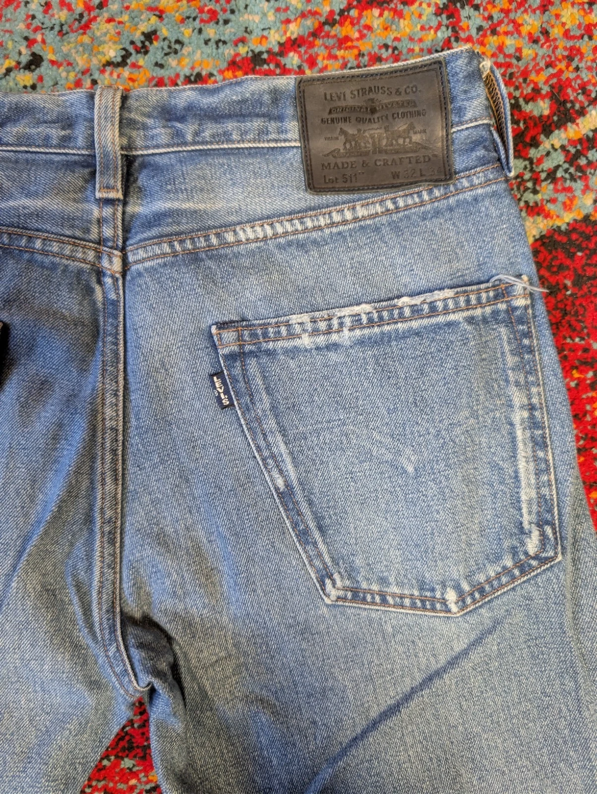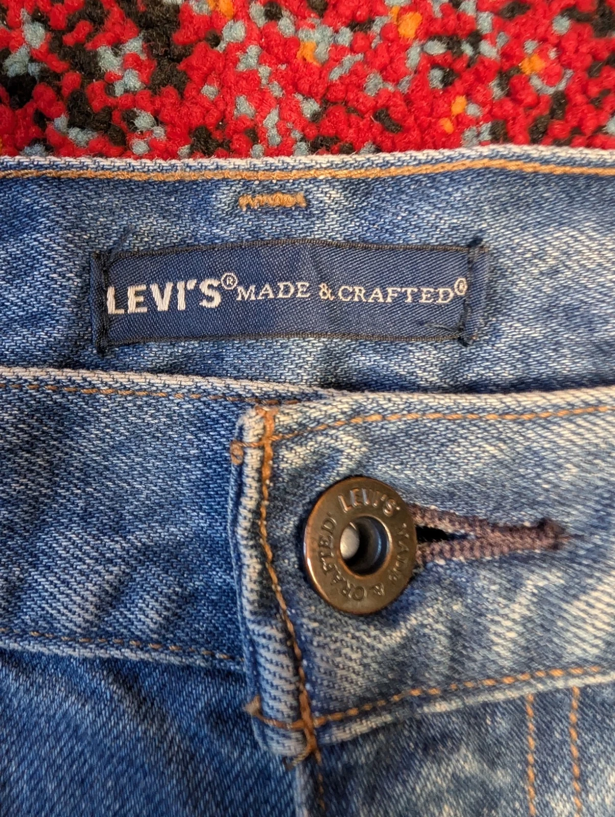 Men's Levi's Made & Crafted jeans. Size 32/34 (Waist 32 in). Slim fit, straight style. Medium wash blue denim. Button and zip closure. Features 5-pocket design, coin pocket, button, logo, and distressed accents. Made of cotton. Machine washable. Suitable for all seasons.