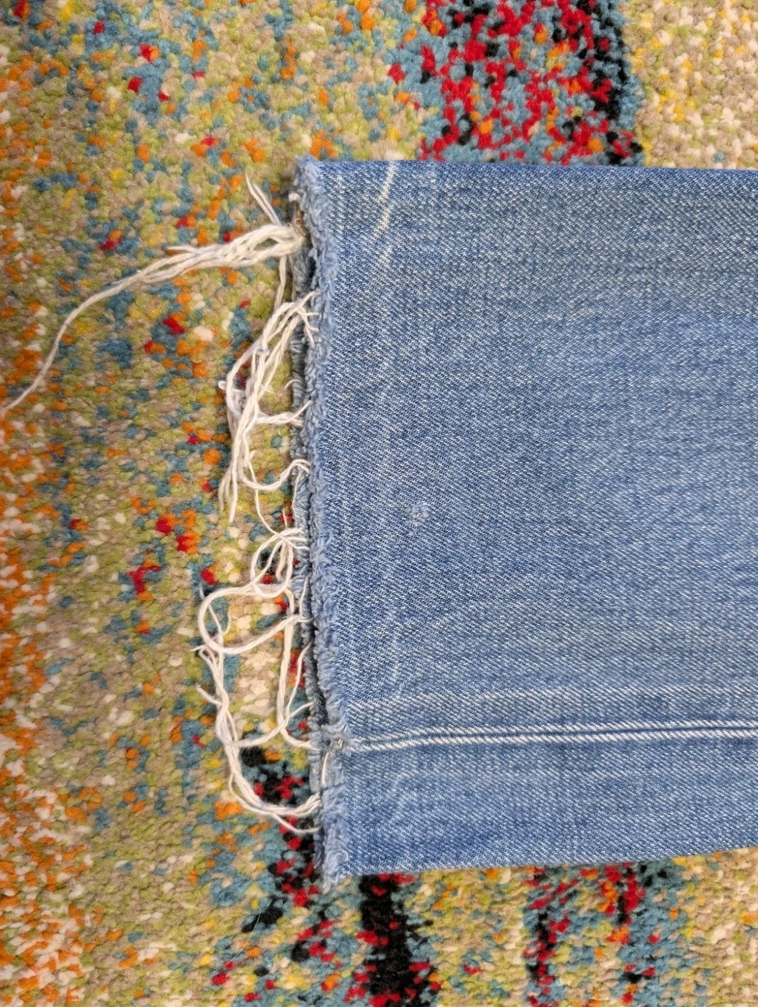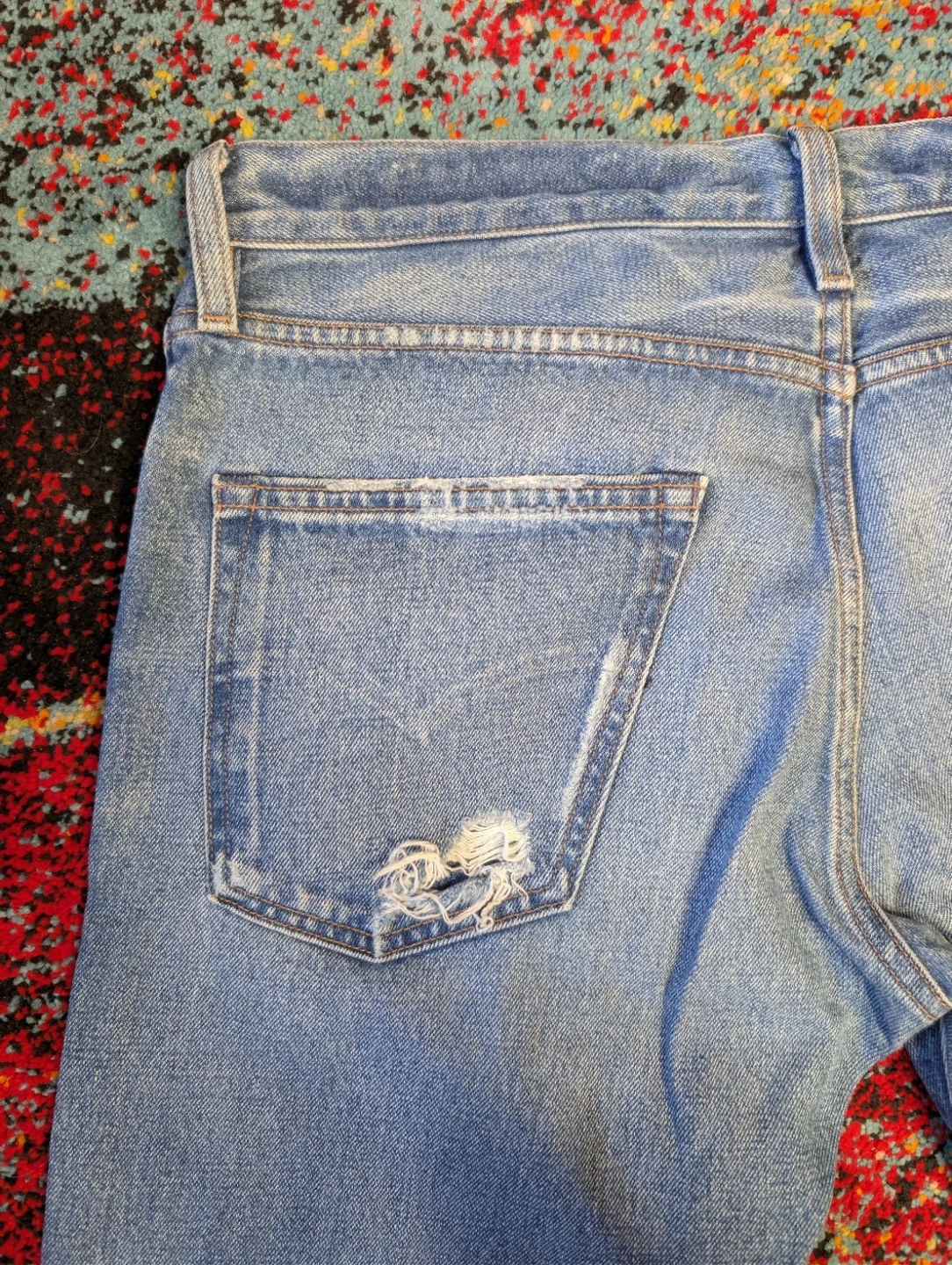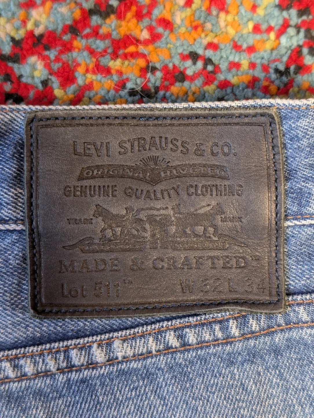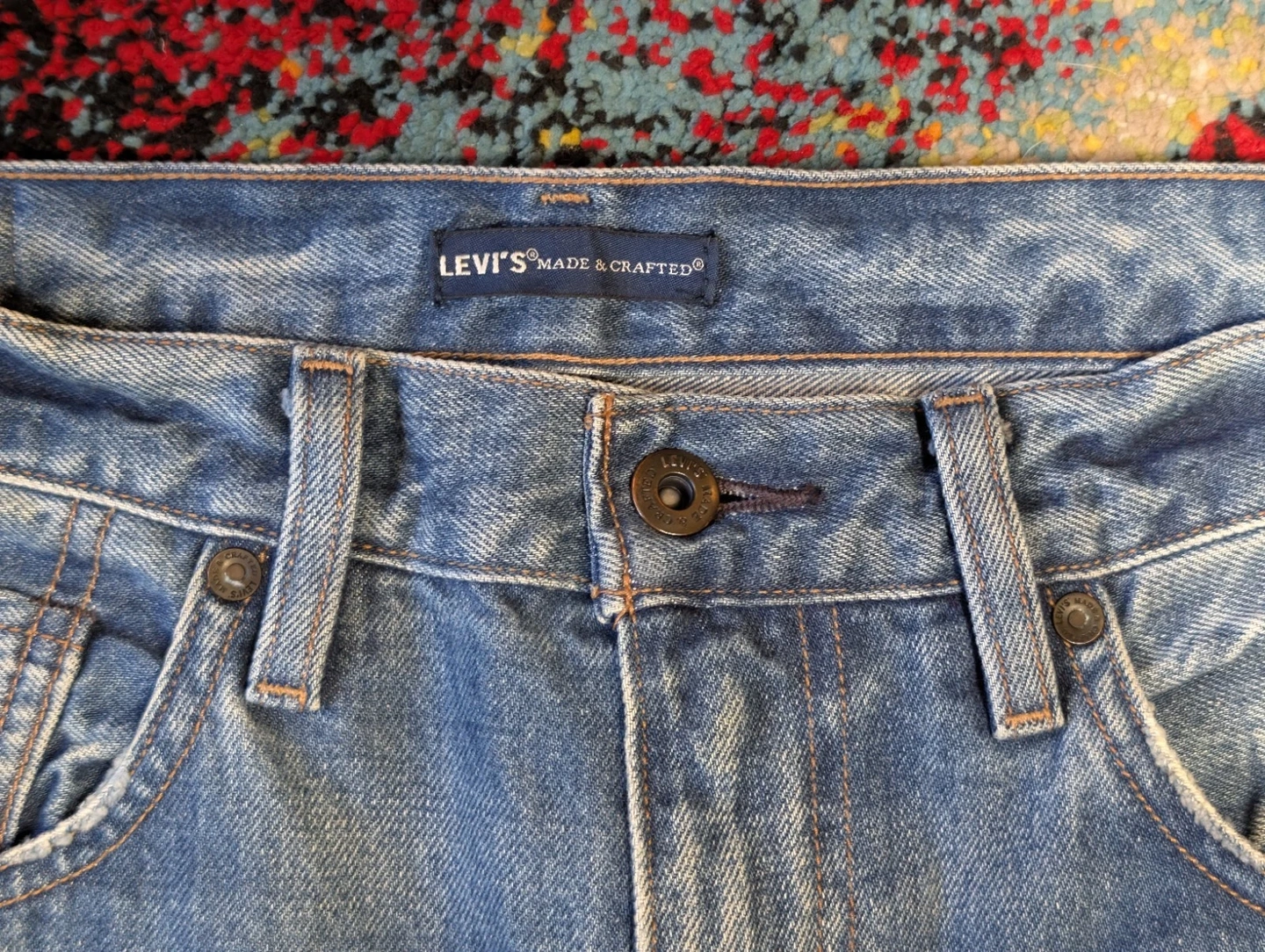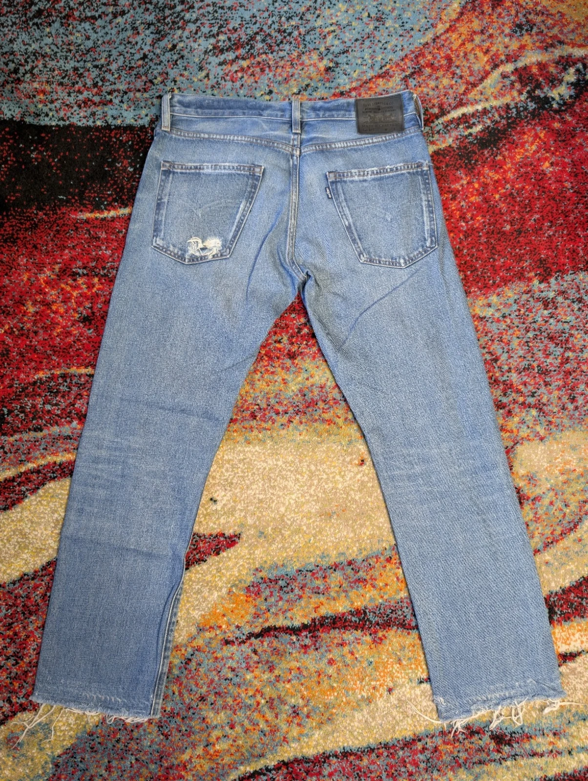 Men's Levi's Made & Crafted jeans. Size 32/34 (Waist 32 in). Slim fit, straight style. Medium wash blue denim. Button and zip closure. Features 5-pocket design, coin pocket, button, logo, and distressed accents. Made of cotton. Machine washable. Suitable for all seasons.