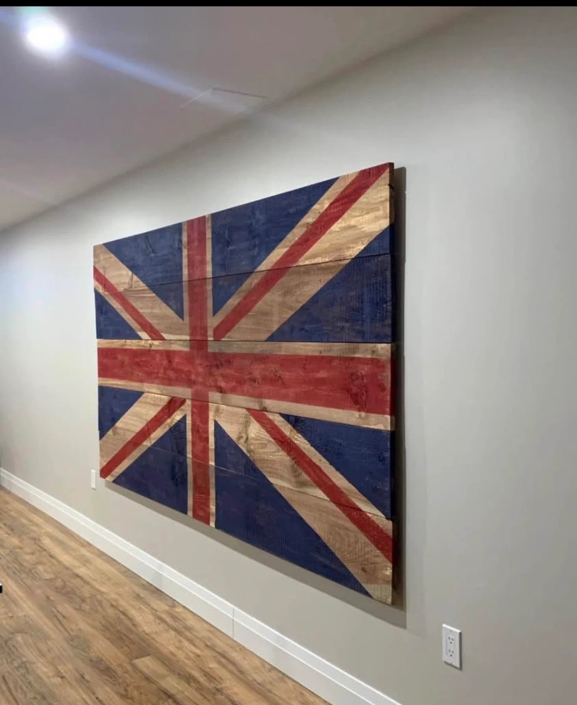 Hand painted rustic wooden wall art featuring the Union Jack flag. Crafted from distressed wood planks for a charming, vintage look. It's a great statement piece and can be used indoors or out!