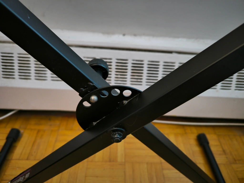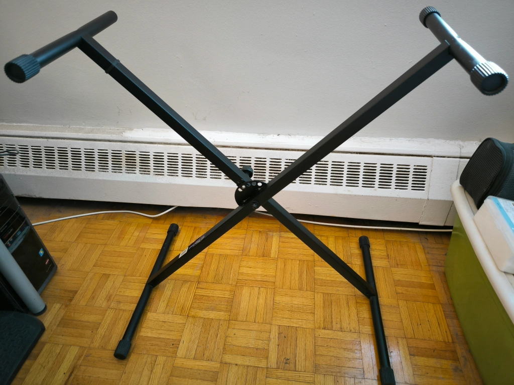 - Includes keyboard stand with adjustable height (see picture 6). However one of the cushions of the stand is missing (see picture 8).