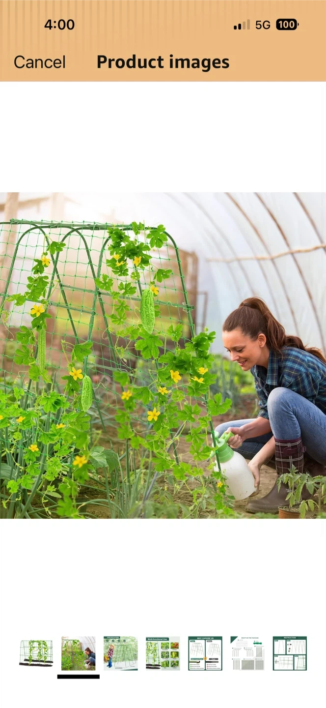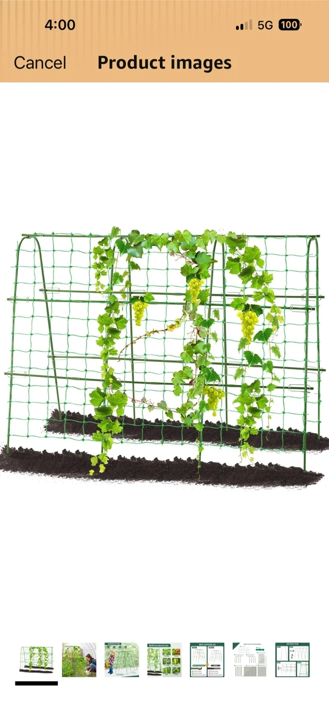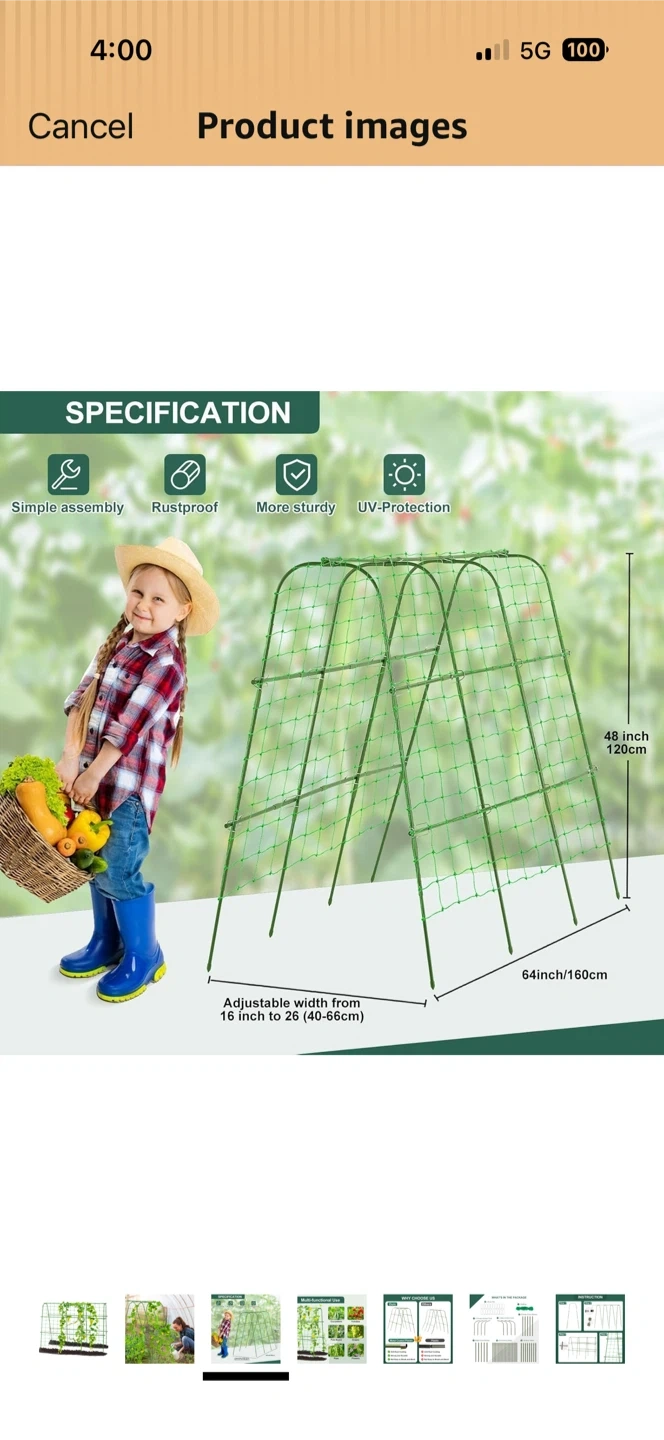 This garden trellis supports climbing plants like cucumbers, tomatoes, and beans. It's 48 inches tall and 64 inches wide, with an adjustable width from 16 to 26 inches. Made from metal coated plastic, it's rustproof and durable!