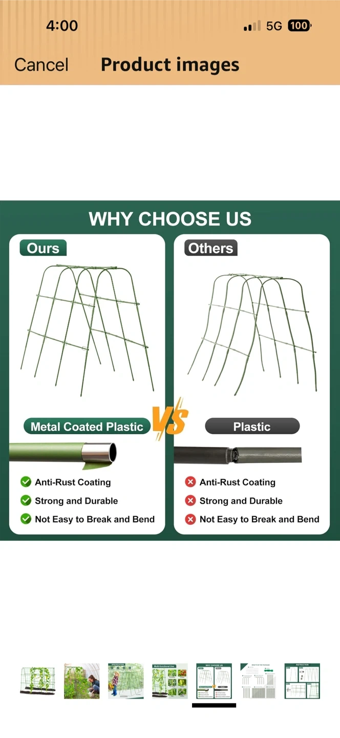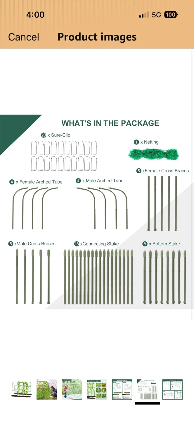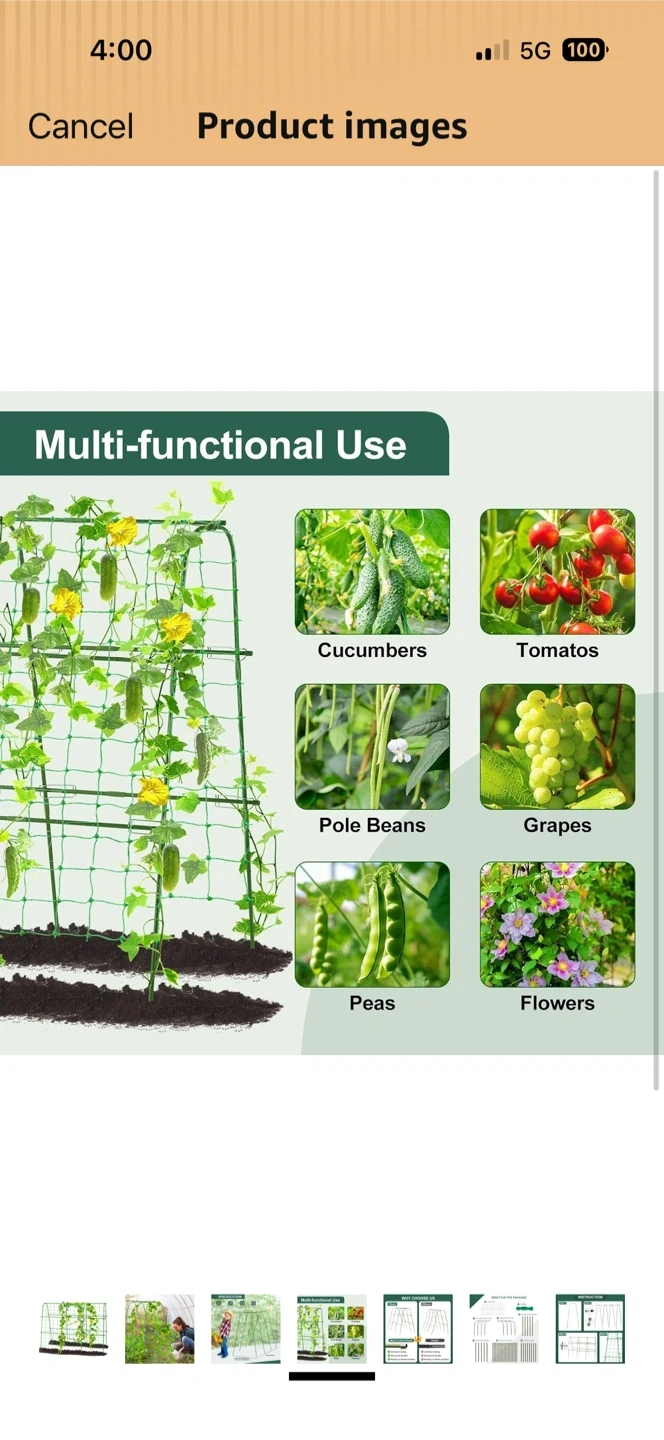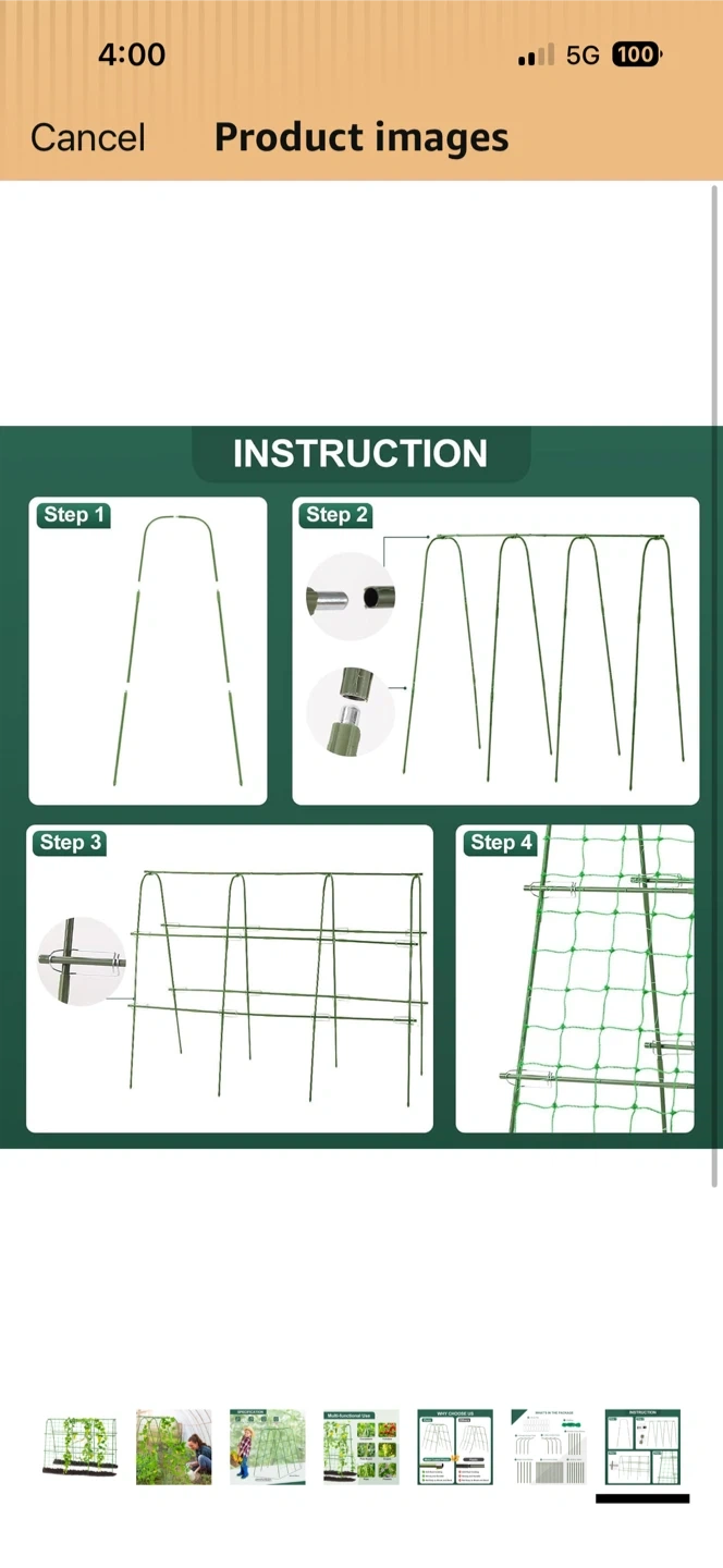 This garden trellis supports climbing plants like cucumbers, tomatoes, and beans. It's 48 inches tall and 64 inches wide, with an adjustable width from 16 to 26 inches. Made from metal coated plastic, it's rustproof and durable!