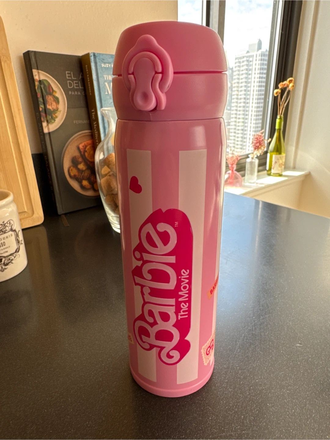This pink insulated water bottle features "Barbie The Movie" branding. It has a secure flip-top lid for easy drinking. Perfect for keeping beverages hot or cold.