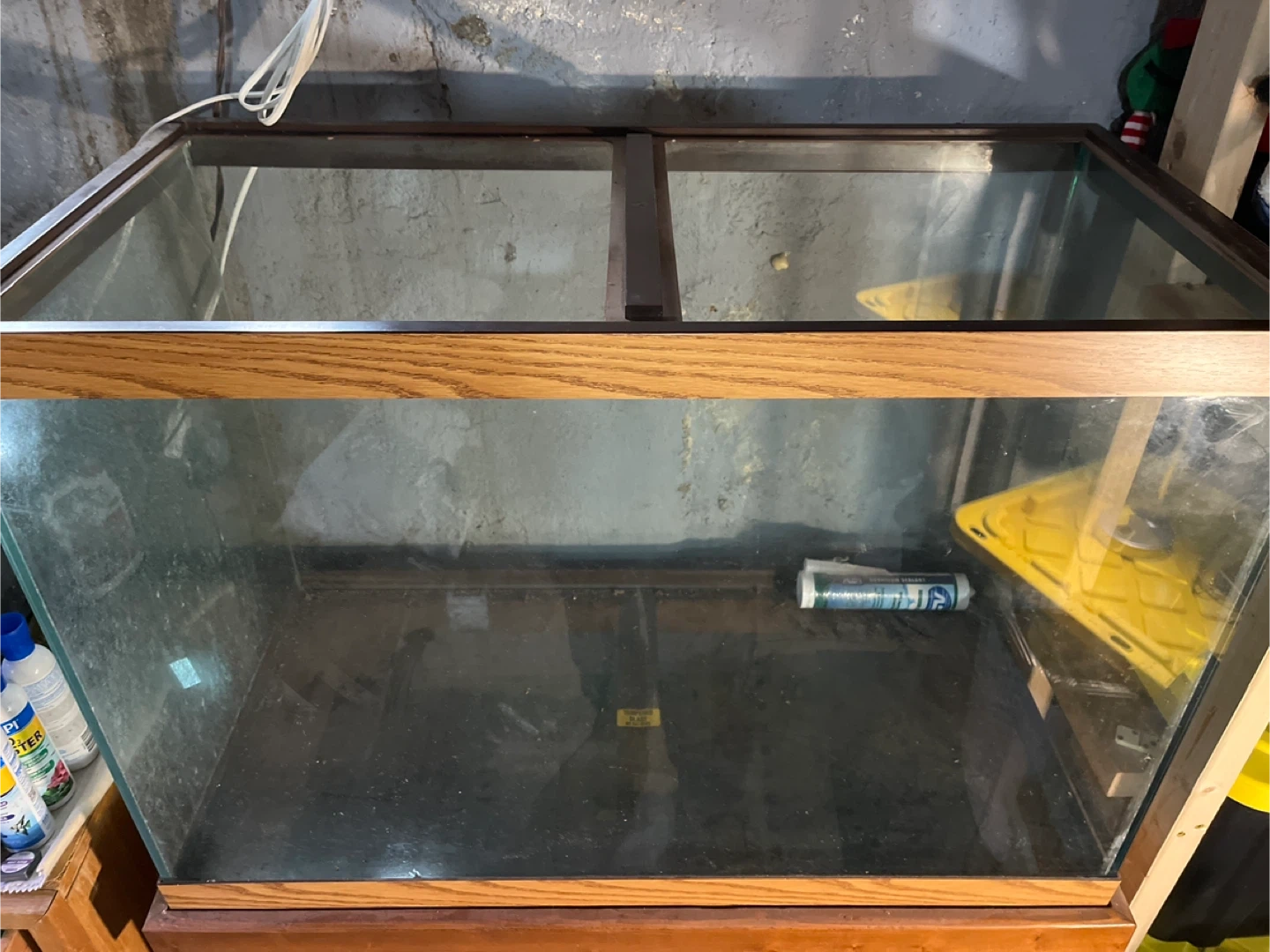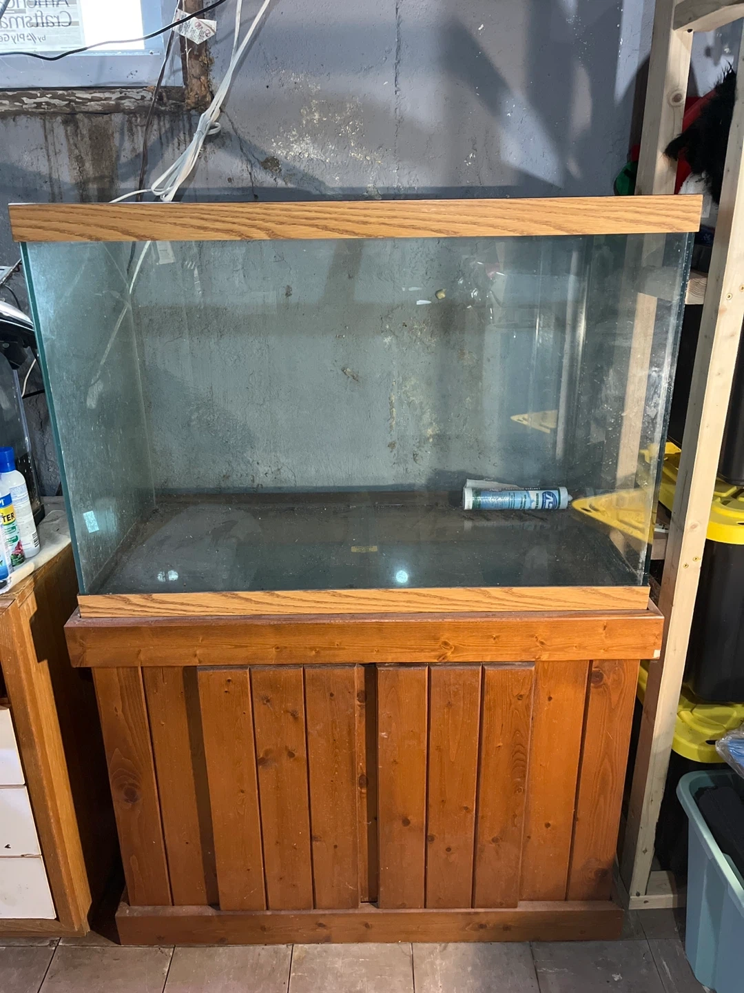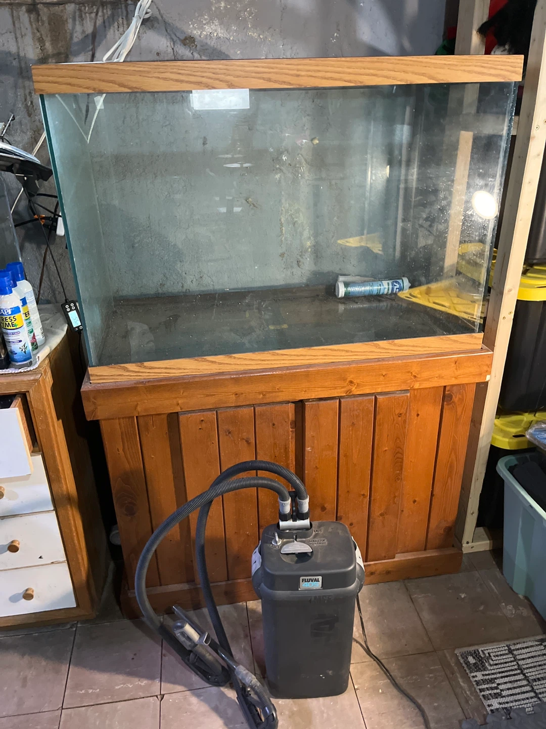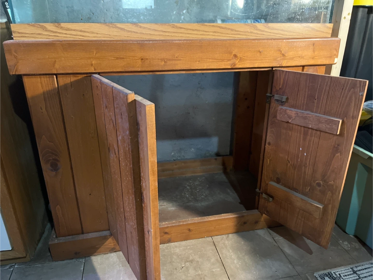 This is a wooden aquarium stand with a large glass tank. The stand has double doors for storage. It's a sturdy piece for your aquarium setup. The tank is empty and ready for its next inhabitants! Includes fluval filter that fits underneath