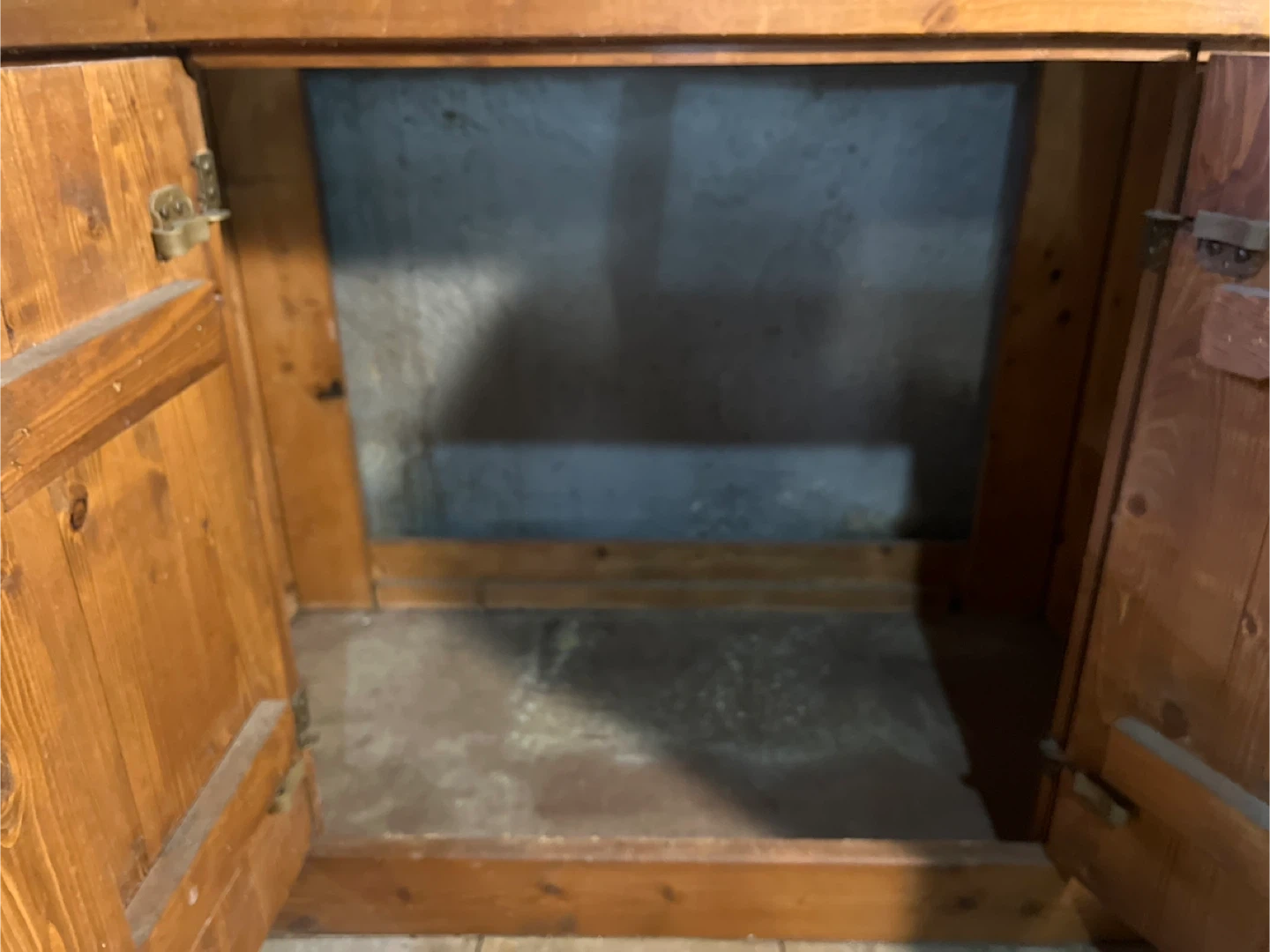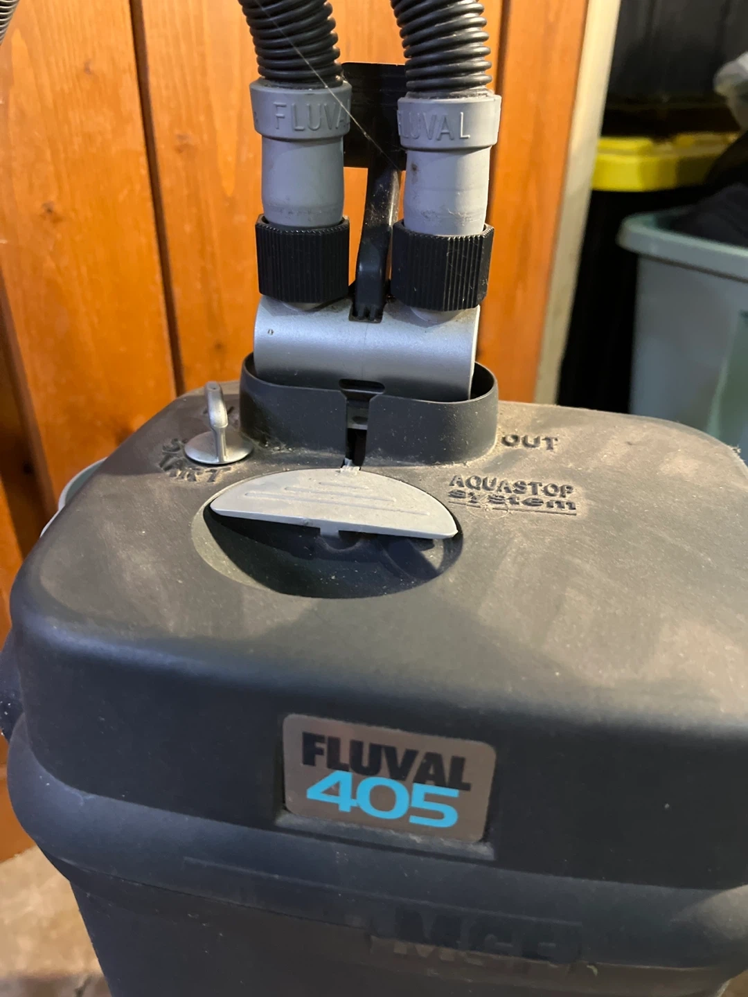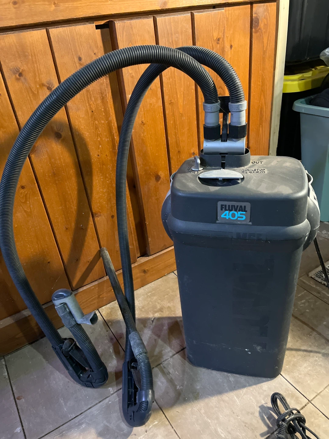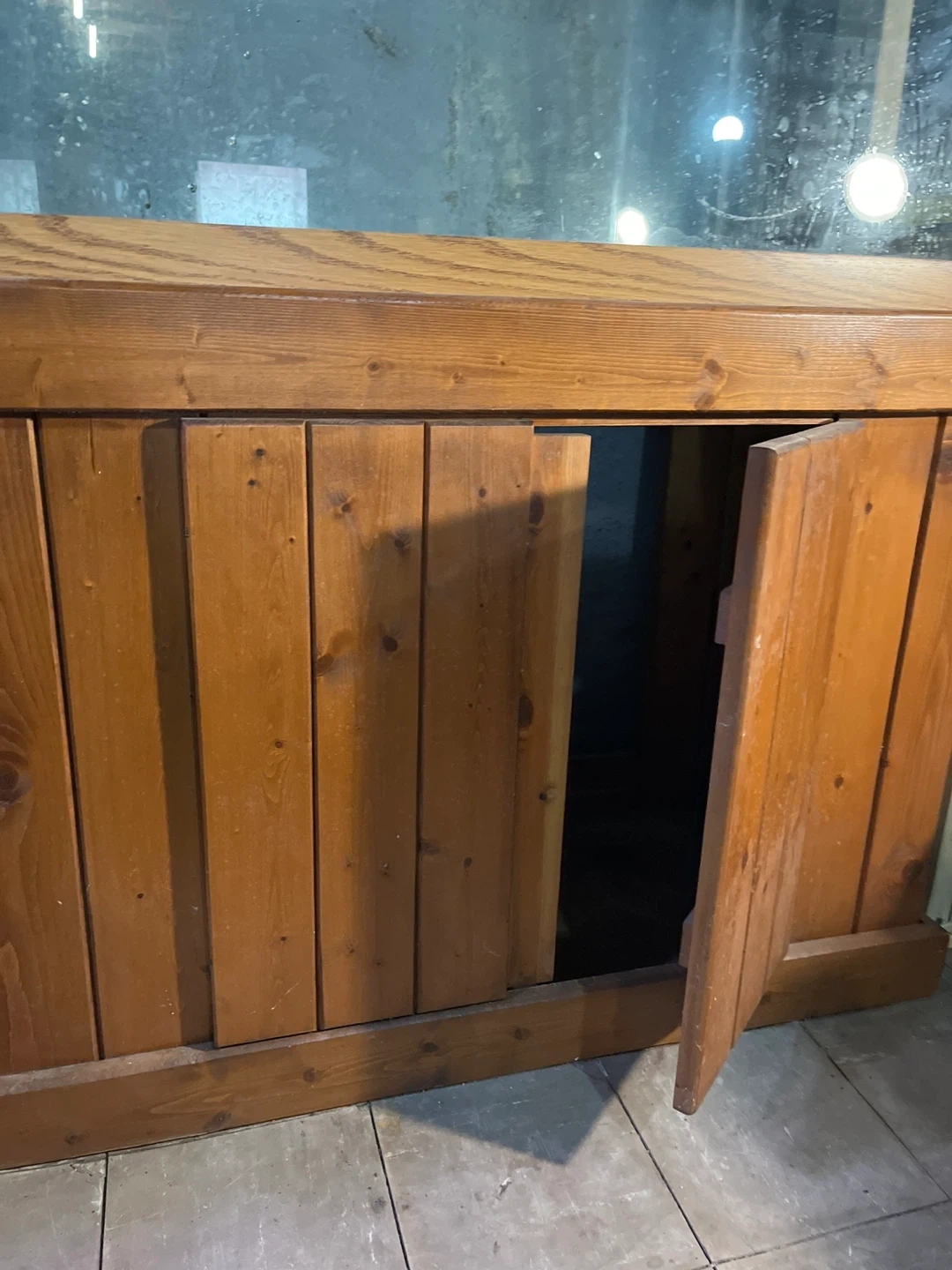 This is a wooden aquarium stand with a large glass tank. The stand has double doors for storage. It's a sturdy piece for your aquarium setup. The tank is empty and ready for its next inhabitants! Includes fluval filter that fits underneath
