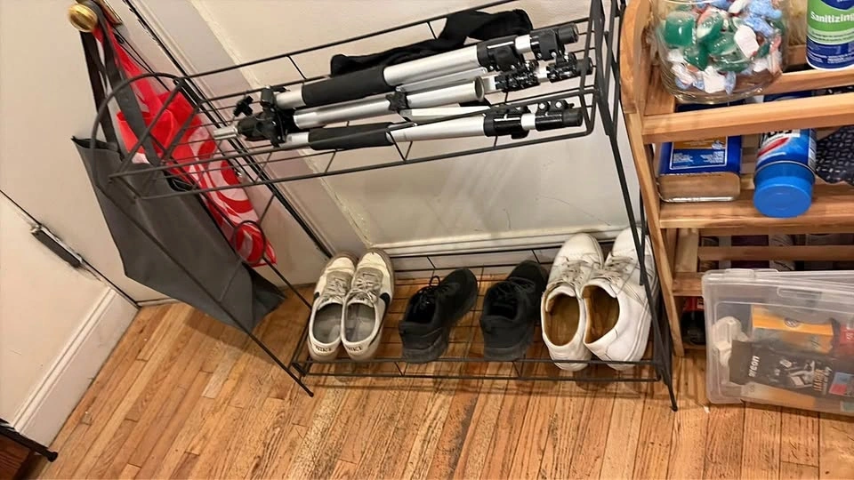 Handy black metal storage rack with multiple shelves for shoes or other items. Includes a side holder for bags or umbrellas. Great for organizing your entryway or closet! Located in Hell's Kitchen.
