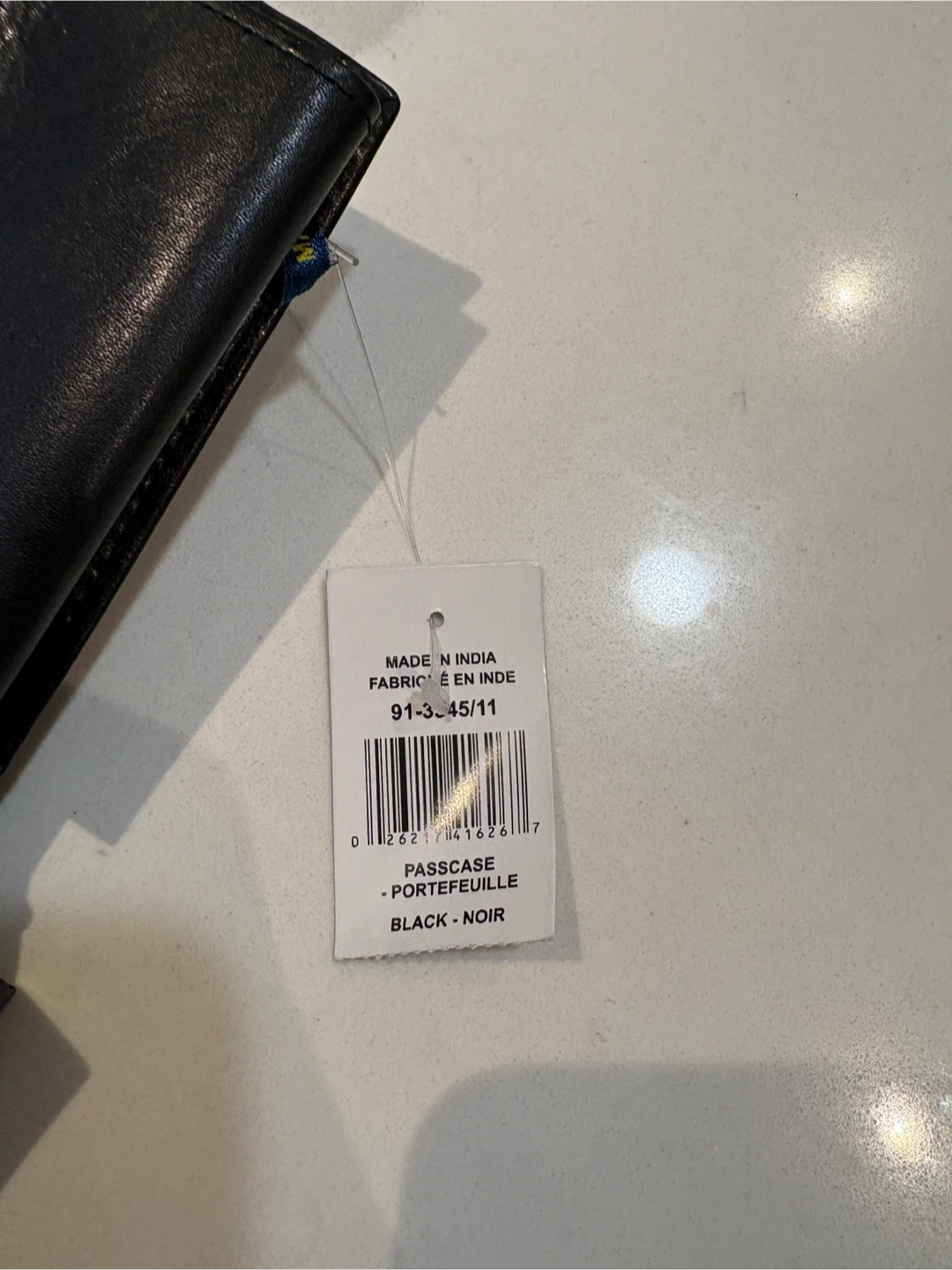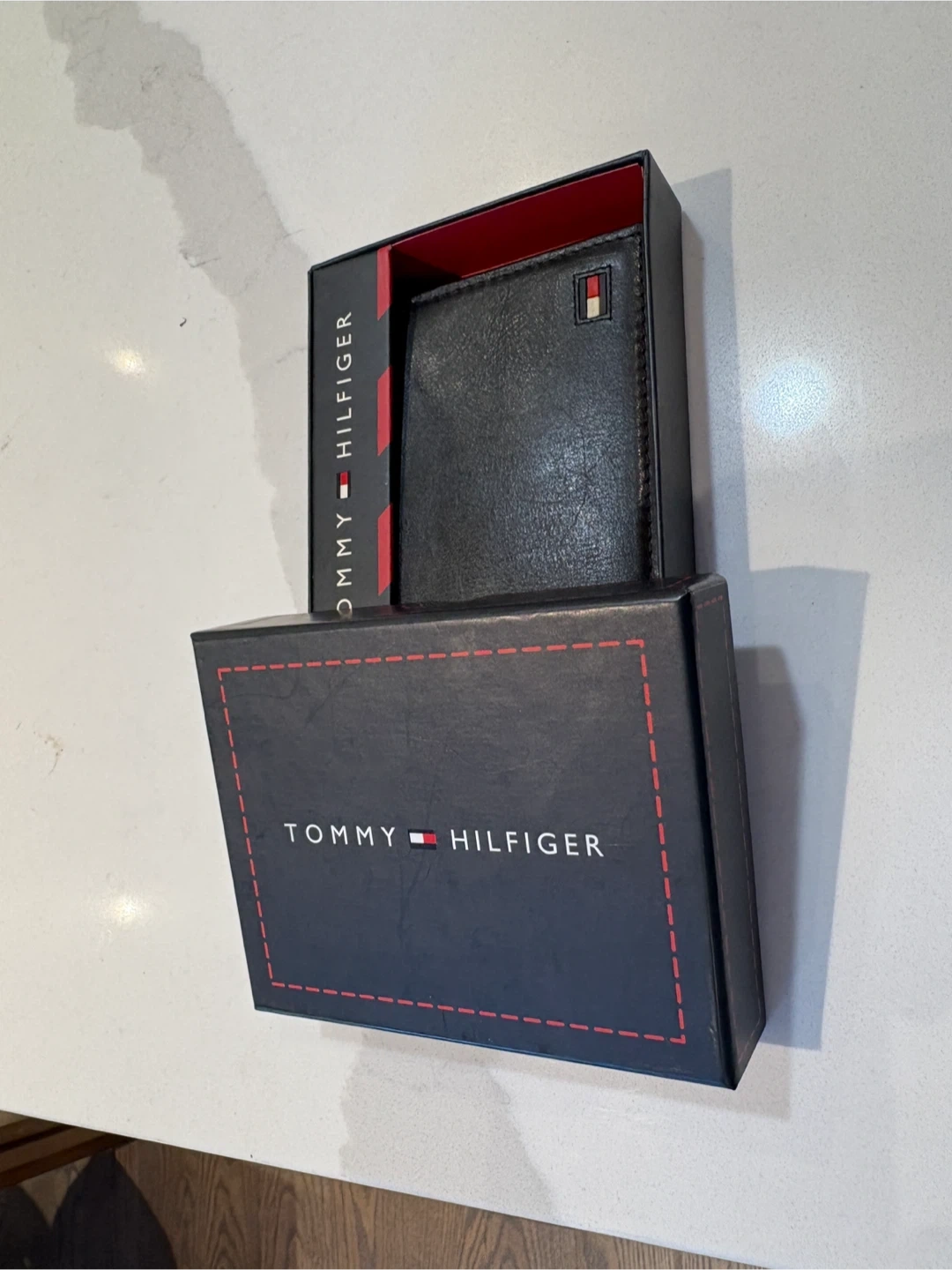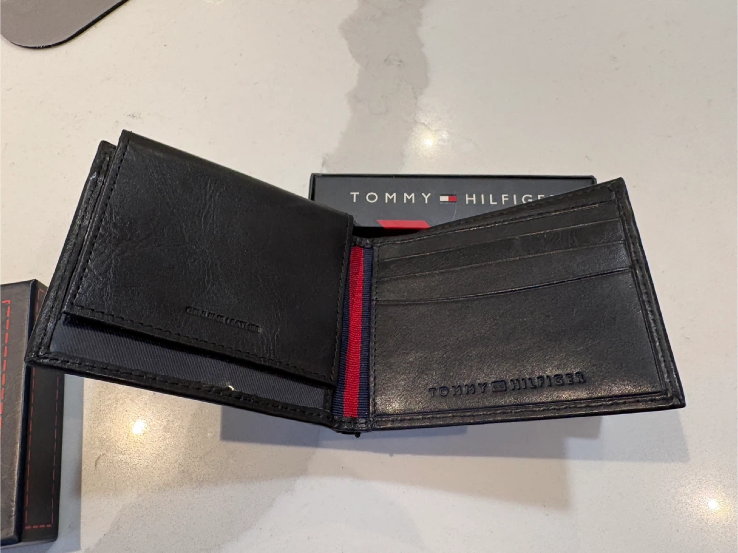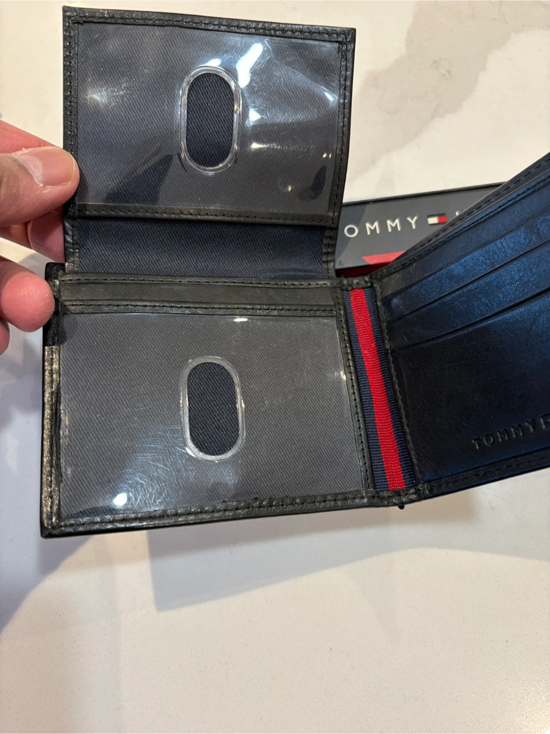 This is a black Tommy Hilfiger passcase wallet. It's made of genuine leather and comes in its original box. Includes card slots and ID windows.
