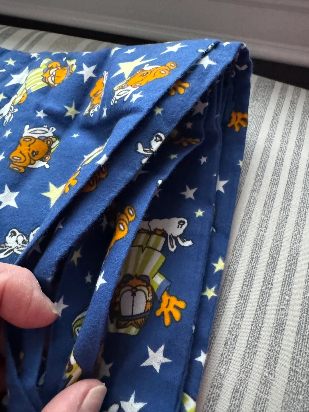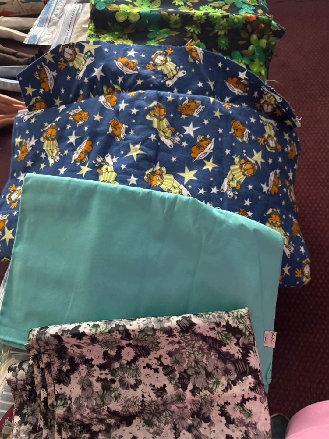 Bundle of Garfield and Friends themed fabric. Includes a blue fabric with Garfield characters and stars. Also includes a solid teal fabric piece and a floral print fabric. Great for quilting or crafts! There are about 8-1/2 yards total