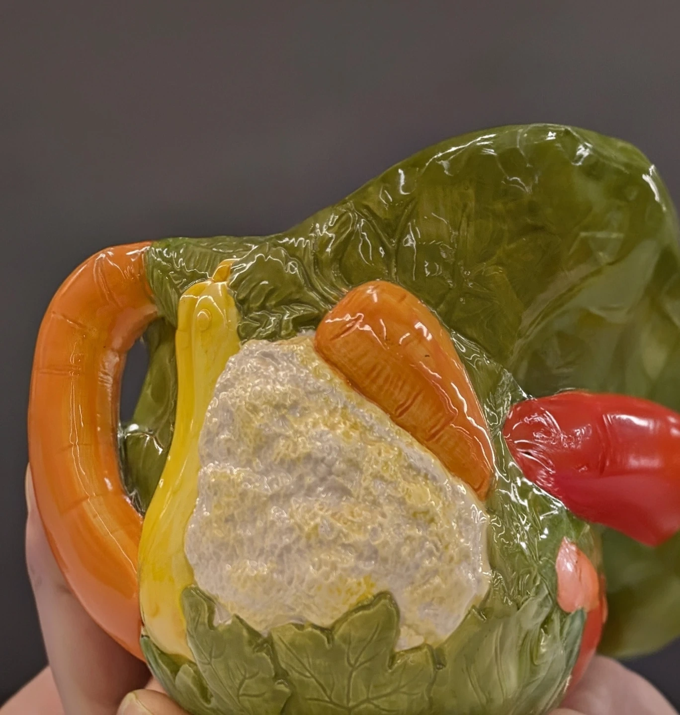 Fun ceramic pitcher shaped like assorted vegetables. It's adorned with carrots, cauliflower, bell pepper, and squash. This piece is great for serving drinks with a whimsical touch!