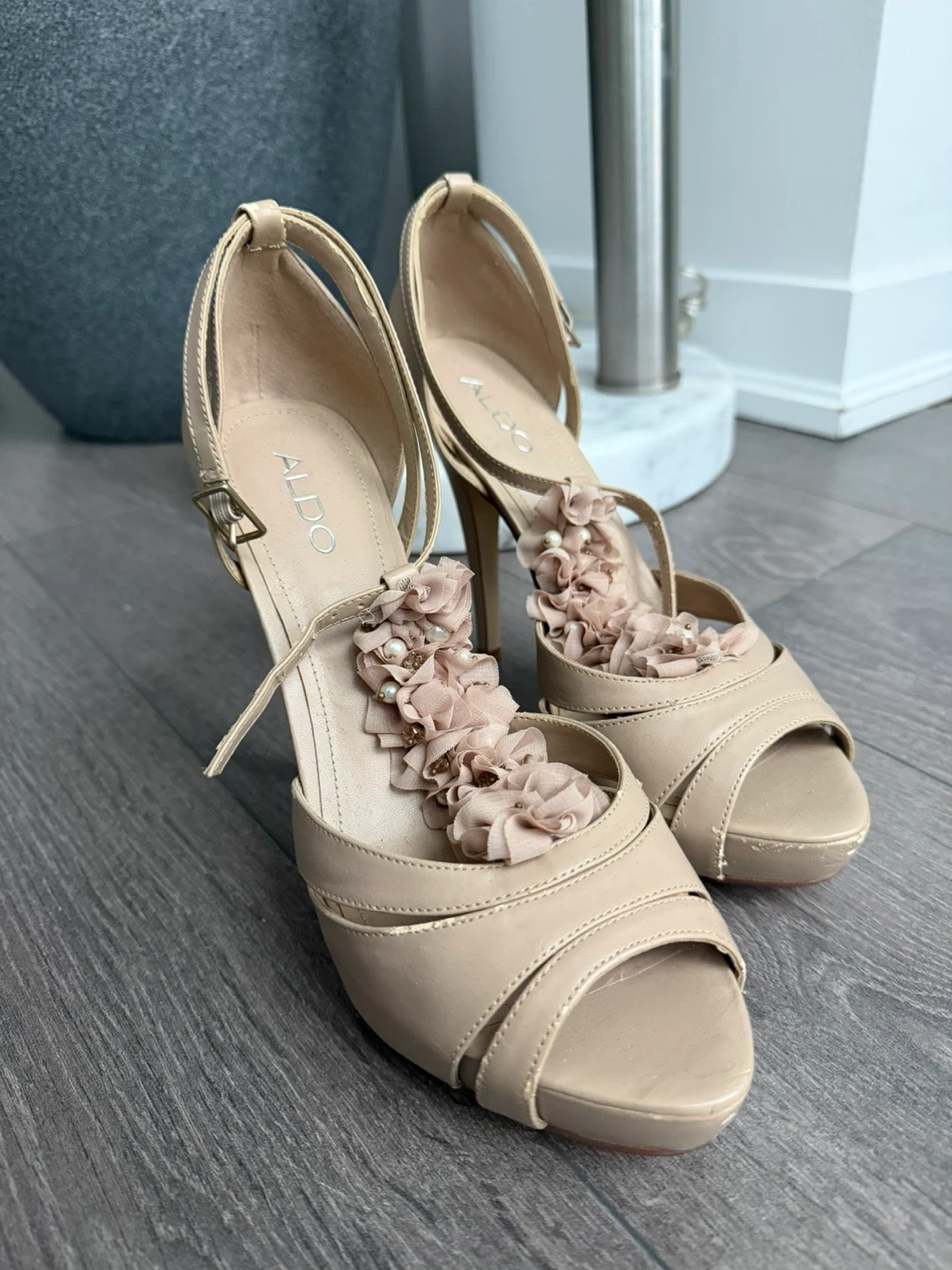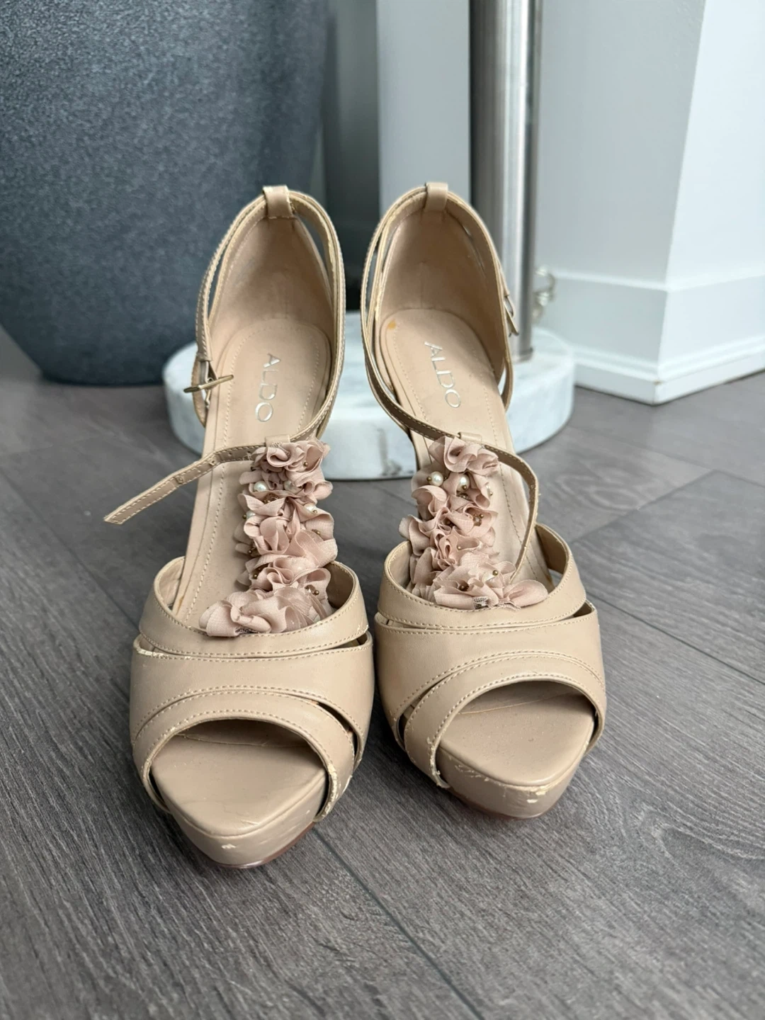 These ALDO heels are a lovely beige colour and feature delicate floral and pearl embellishments on the front strap. They have an ankle strap with a buckle for a secure fit. A great choice for dressing up an outfit!