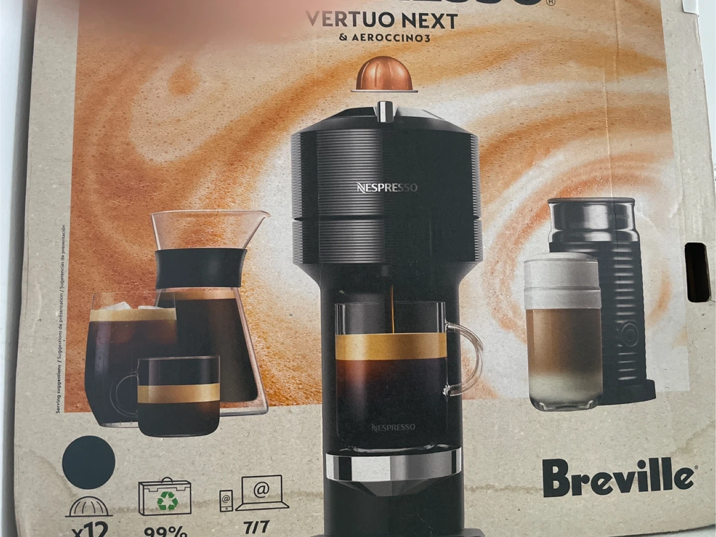This Nespresso Vertuo Next coffee machine comes with the Aeroccino 3 milk frother. It's designed for making various coffee drinks. Includes original box and accessories.