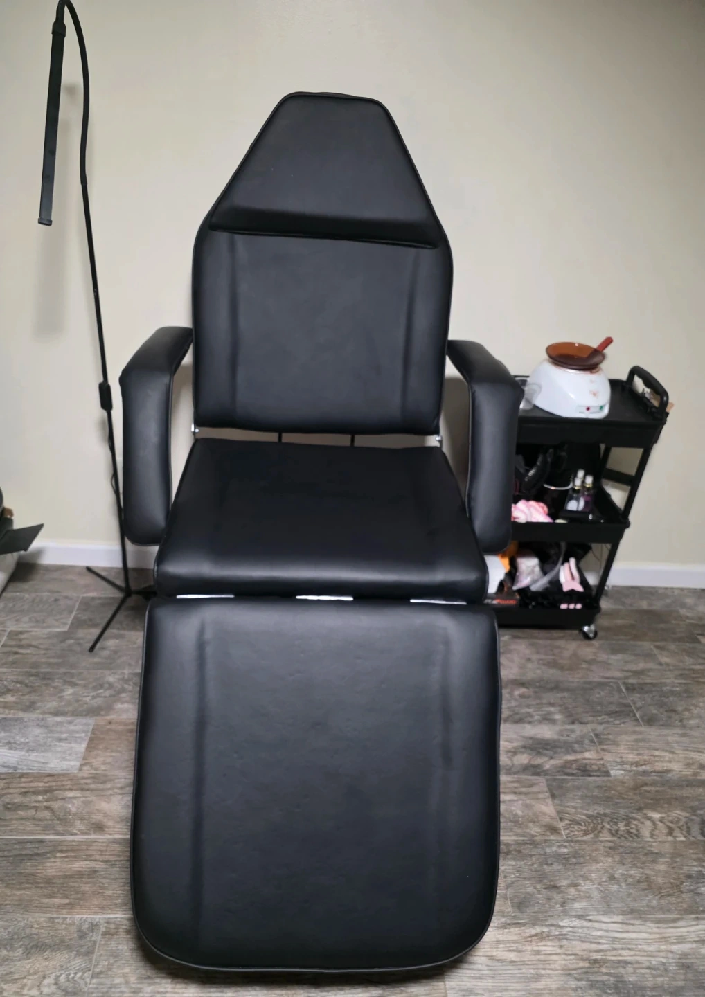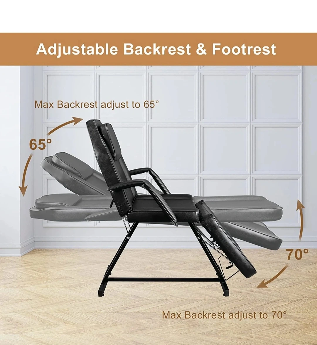 This black salon chair features an adjustable backrest and footrest. The backrest can adjust up to 65 degrees, and the footrest can adjust up to 70 degrees. It's made for comfort and utility in a salon or spa setting.