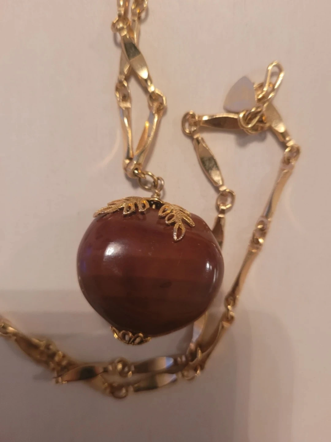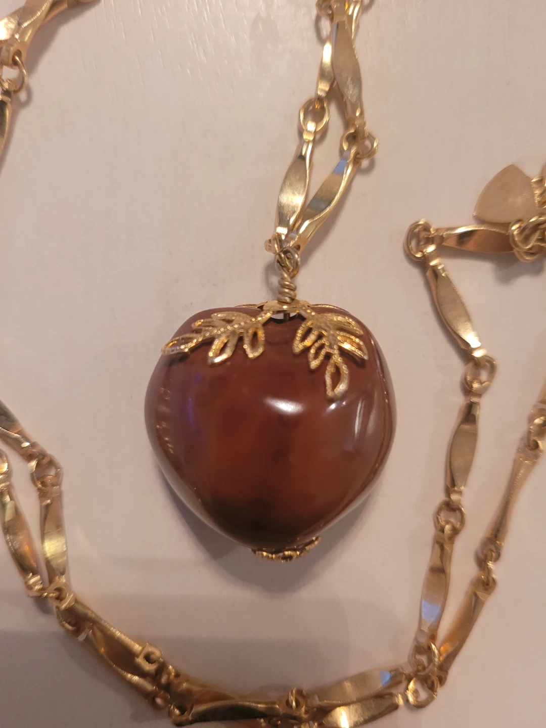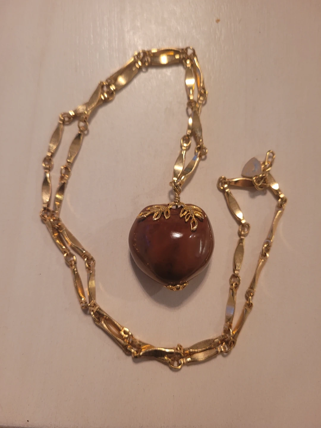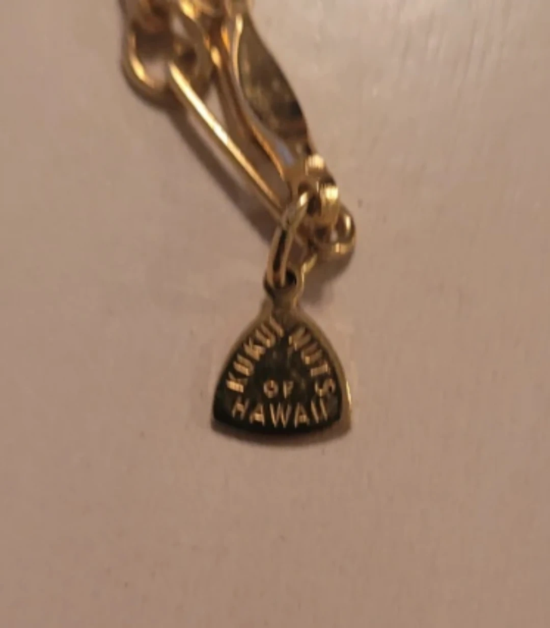 I'm selling a long gold-tone chained necklace with a polished Kukui nut pendent. It's a lightweight necklace and in great condition! Would love to have it go to a good home.