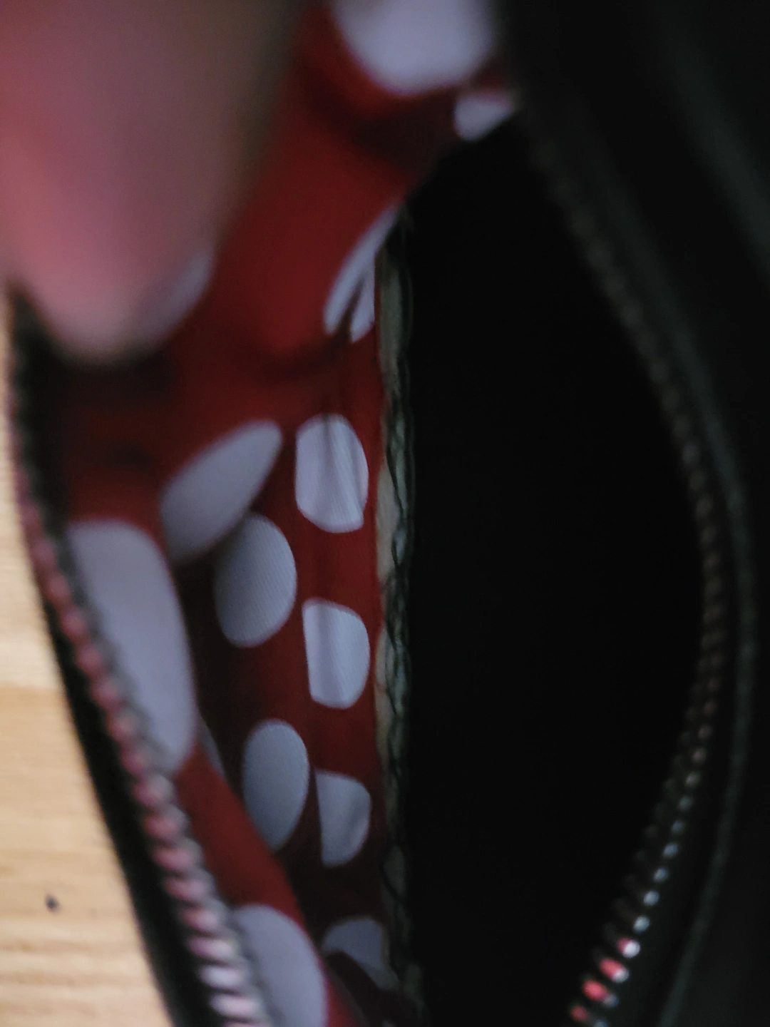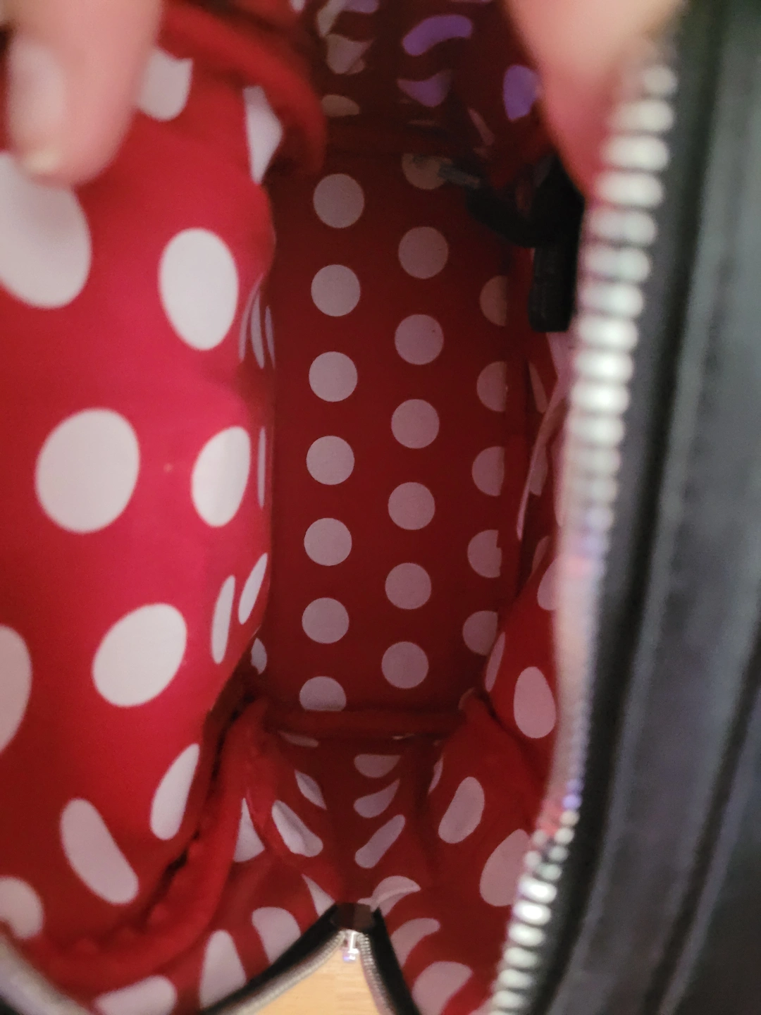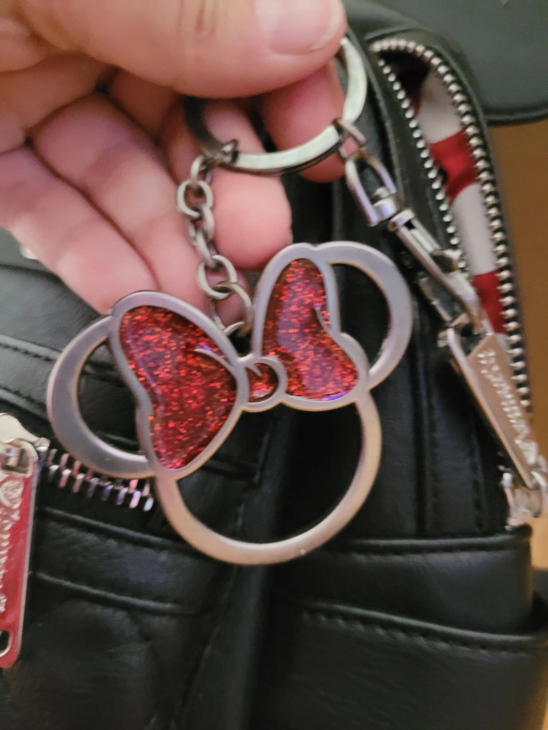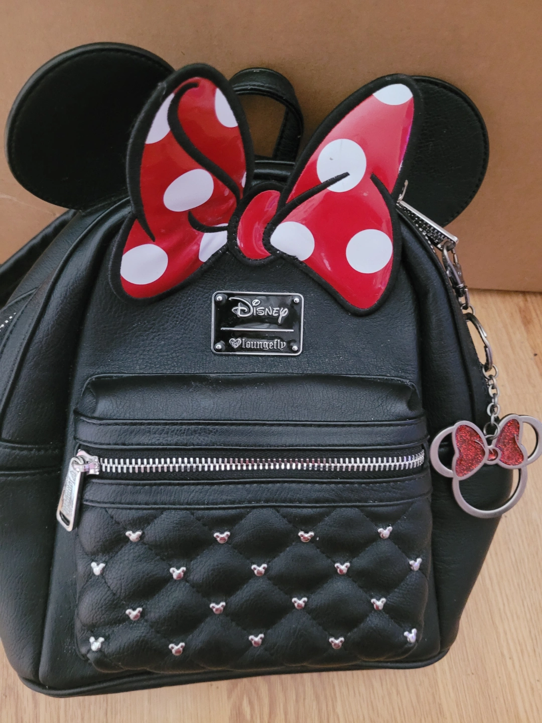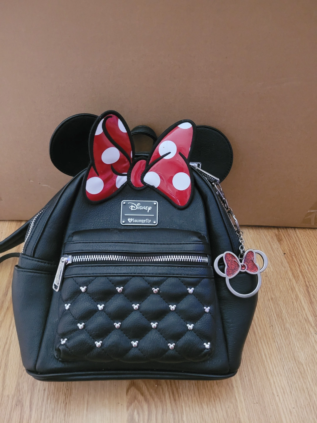 Black faux leather quilted mini backpack. Features Minnie Mouse ears and bow. Red polka dot interior lining. Includes a Minnie Mouse bow keychain bought at Disney Parks for free. Silver-toned hardware. I've included pics of the interior lining of the pocket and the backpack. this was literally used once!