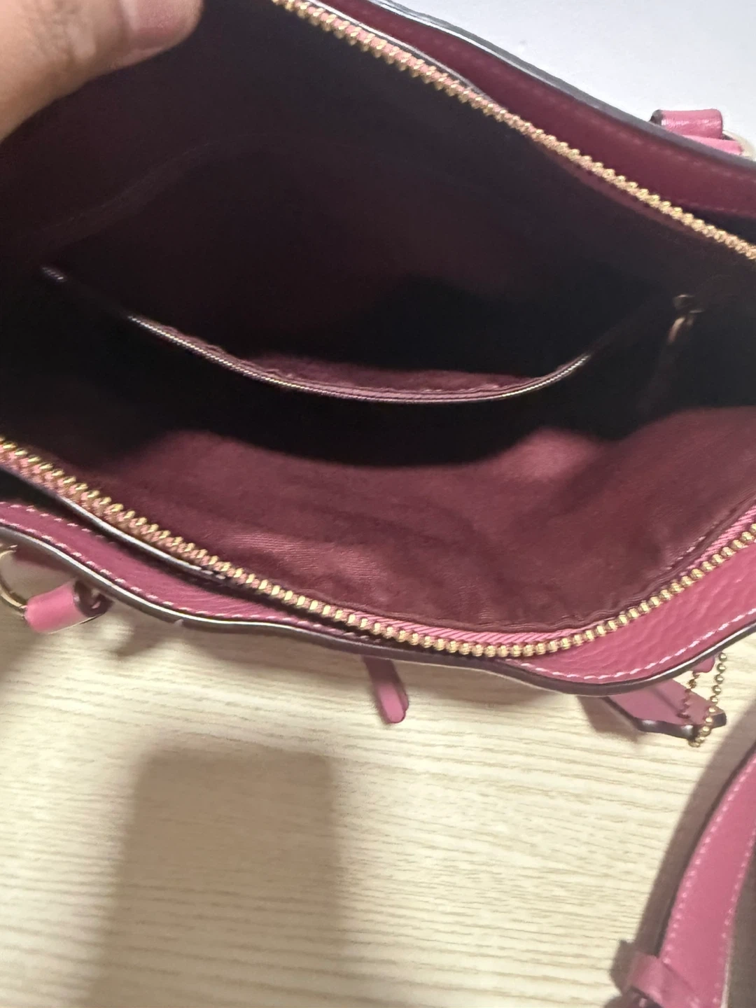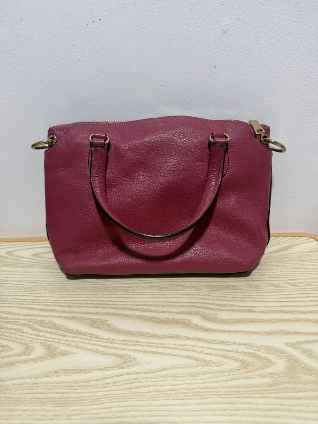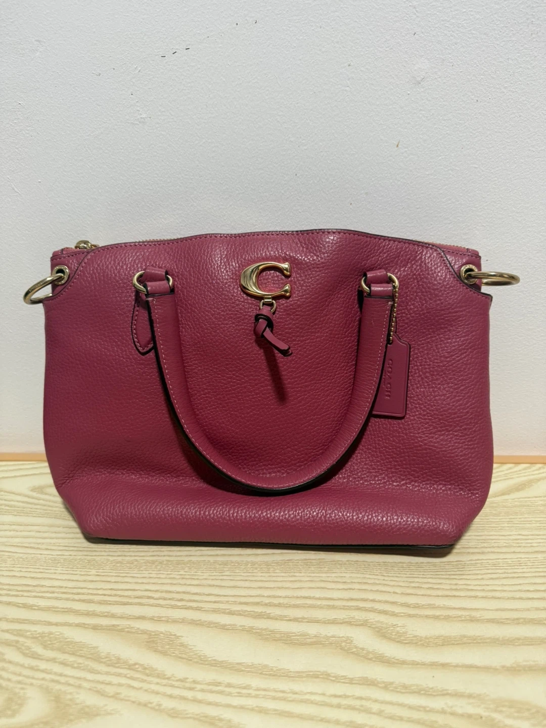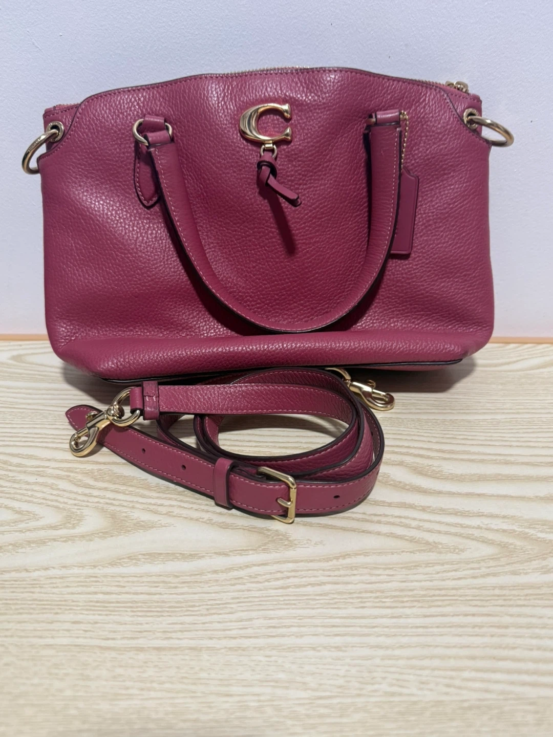 This is a Coach satchel handbag made from pebbled leather in a magenta color. It includes a detachable shoulder strap and gold-tone hardware. The interior has multiple compartments for organization. A great everyday bag!