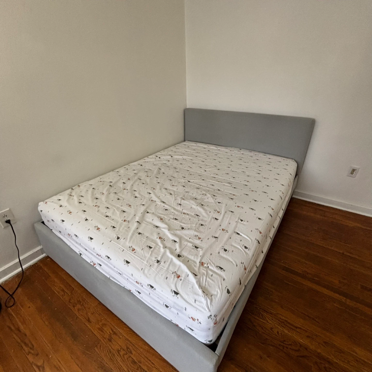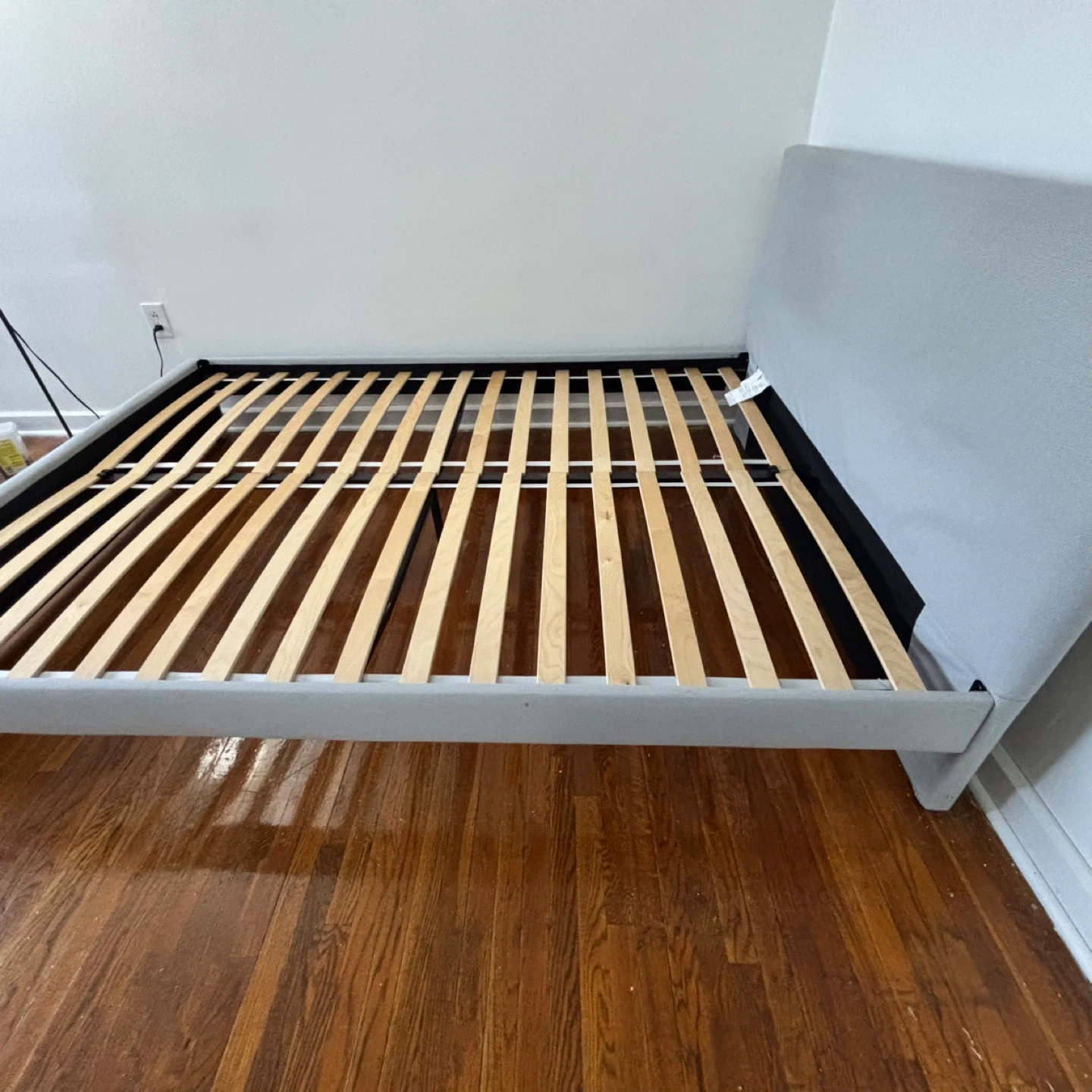 This upholstered bed frame comes with a light grey fabric finish and a simple headboard. It features a slatted wooden base for mattress support. It's great for a bedroom needing a modern touch.